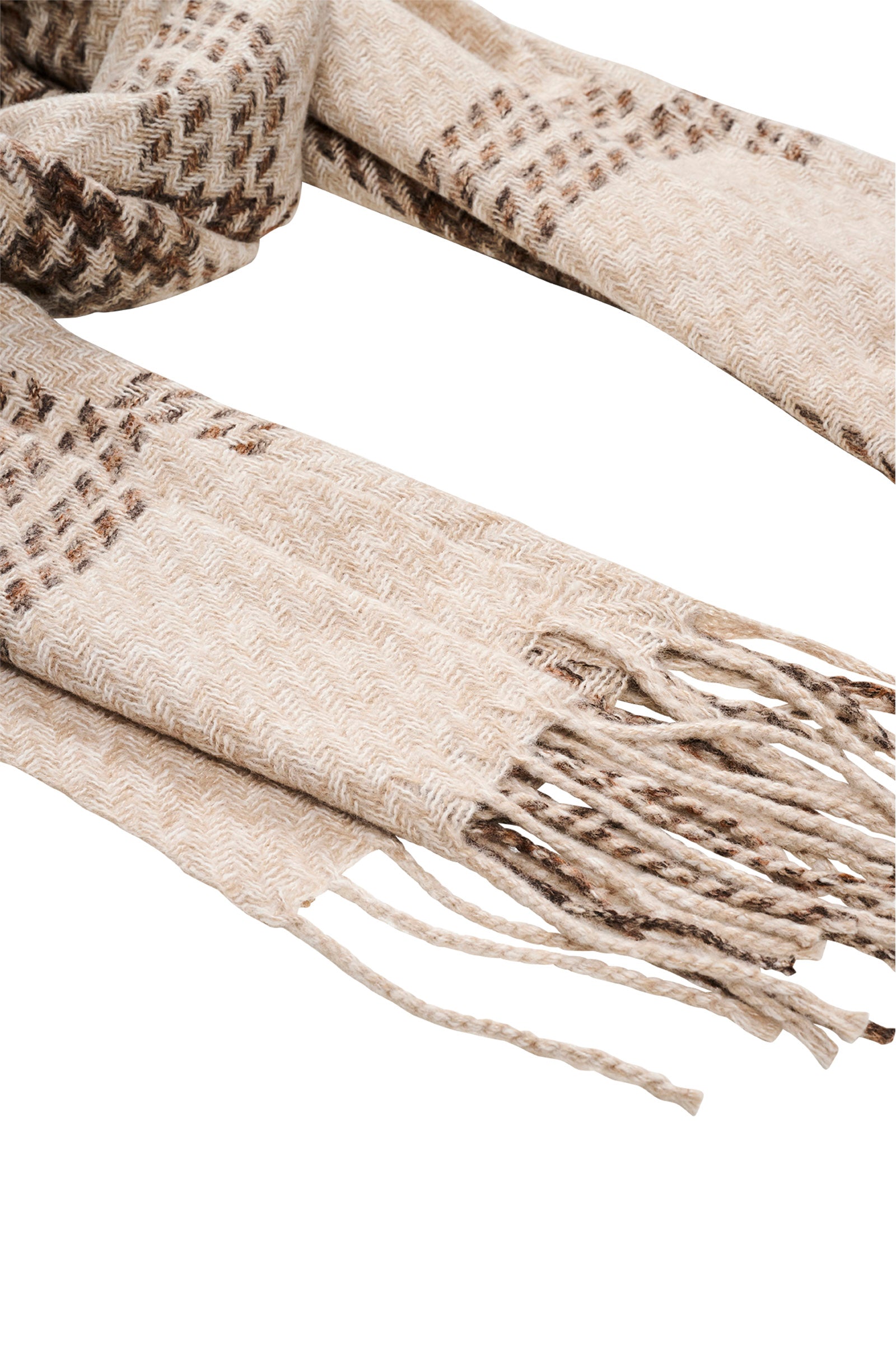 A softly woven scarf with subtle contrasting lines and fringe detailing. Warm, comfortable and easy to wear without bulk.