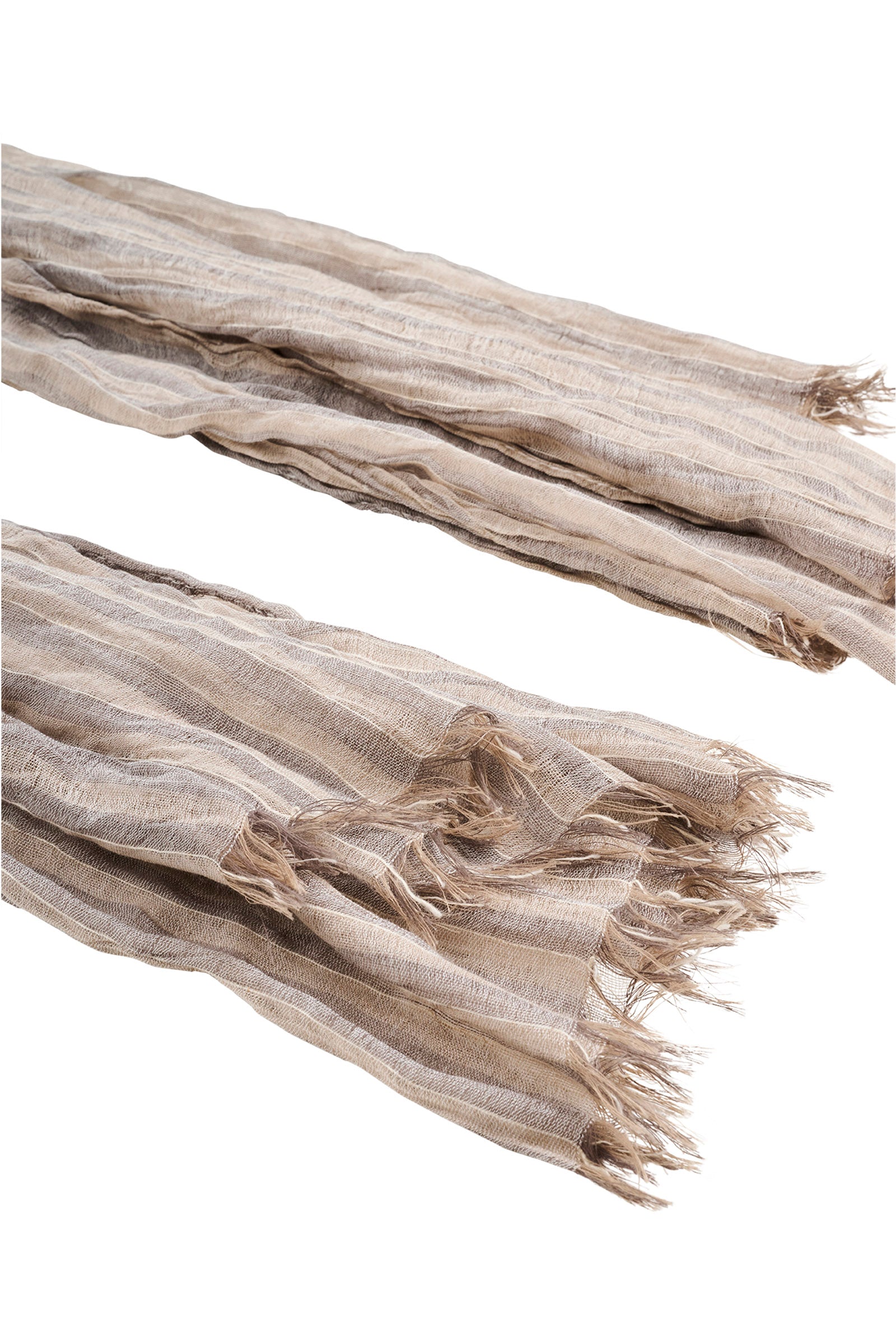 A lightweight, textured scarf with a natural stripe and soft frayed edges. Designed for easy, transseasonal layering.