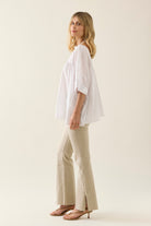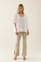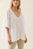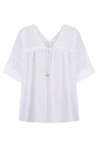 Designed for comfort and movement, the Aurora Relaxed Top features a flattering V-neck at front and back, a dropped sleeve with cuff, and neck ties finished with gold beads. The cotton voile fabric gives it an airy feel.