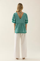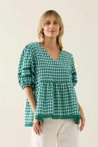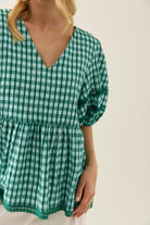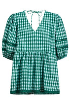 Crafted from breezy gingham seersucker, this flowing top features a V-neckline with centre-back tie, lace-trimmed puff sleeves and hem, and a gathered waist for shape.