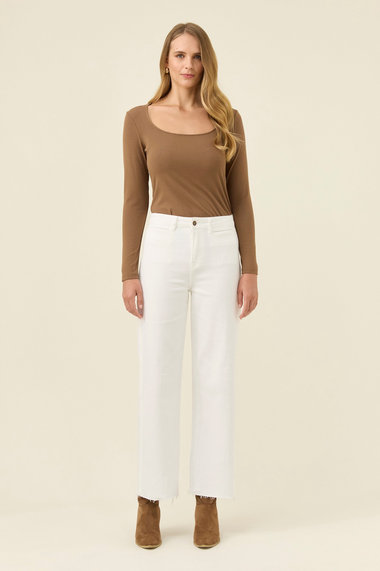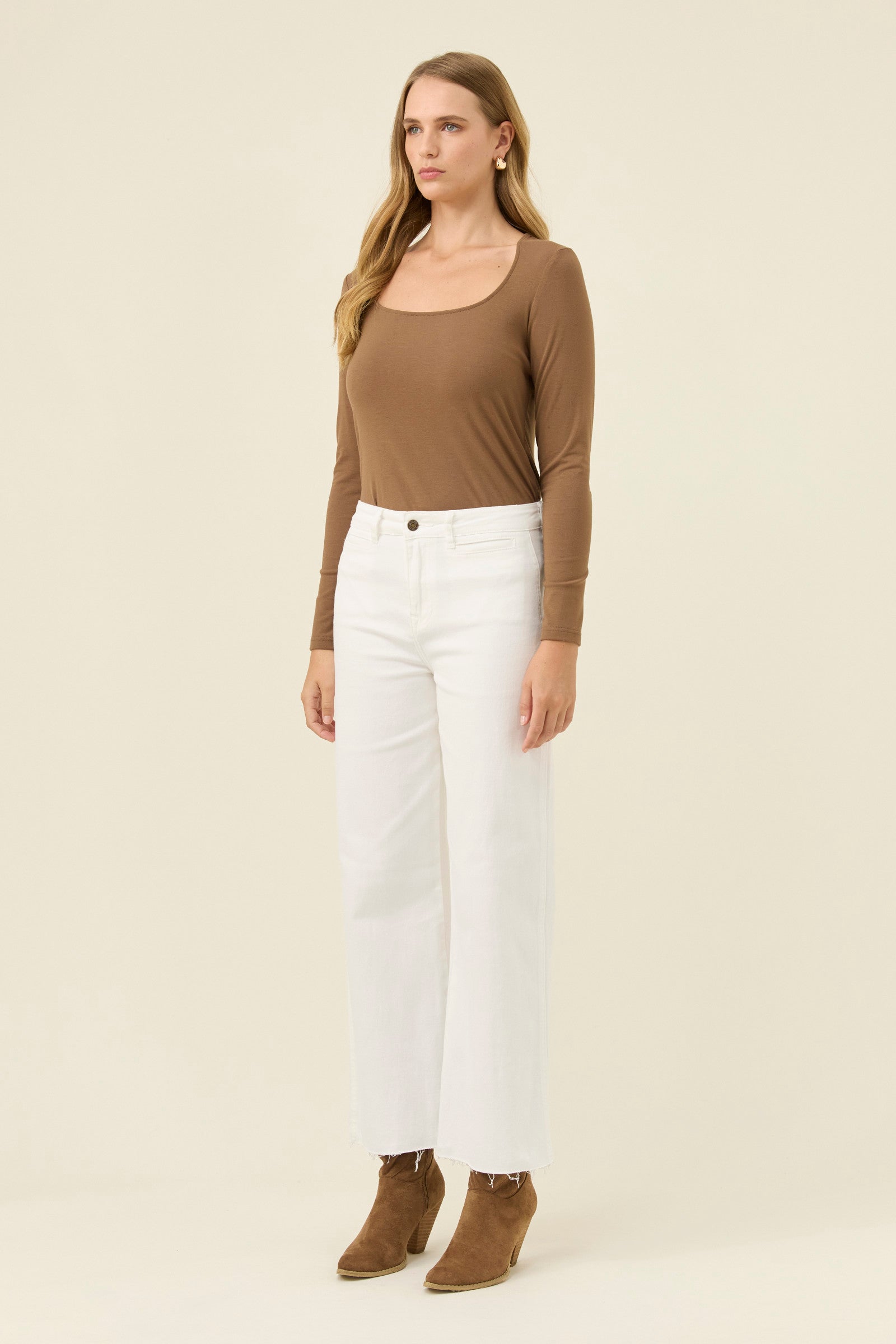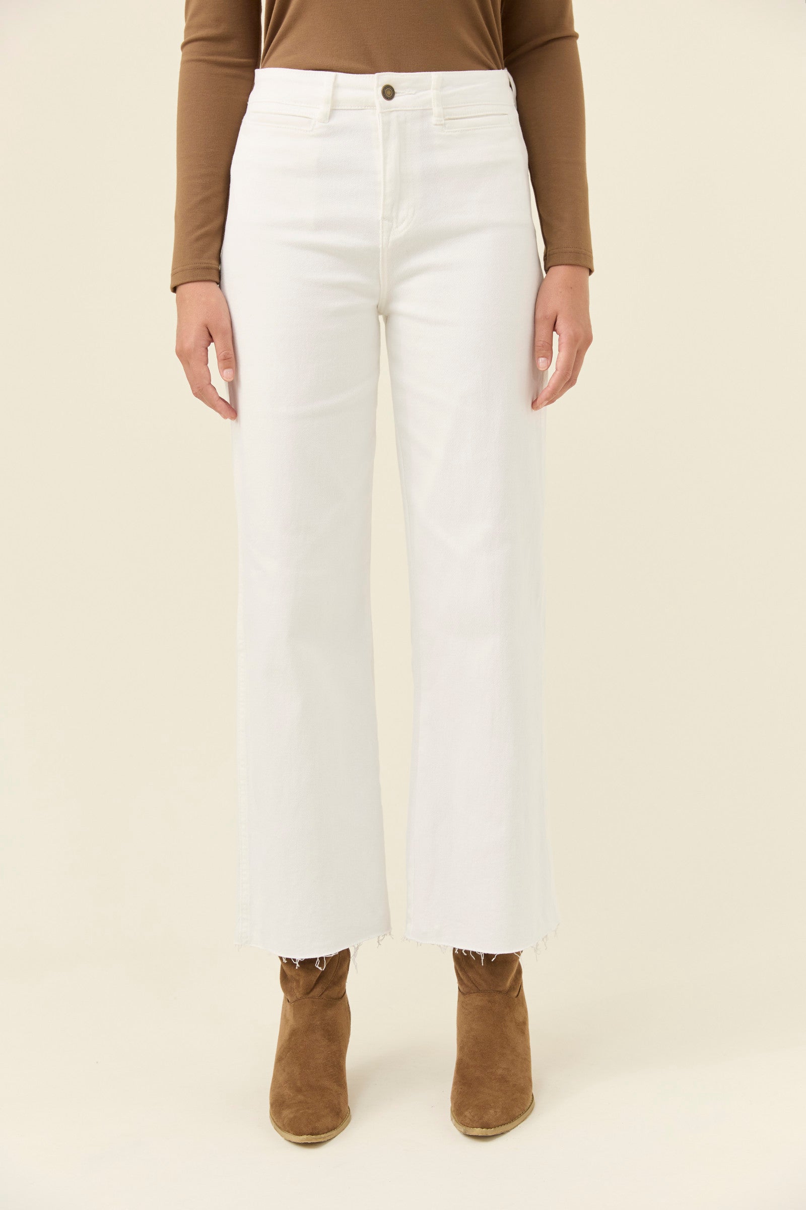 A modern wide-leg jean designed with a soft, comfortable stretch and a clean high-rise waist. The front welt pockets and back patch pockets bring a subtle tailored feel, balanced by a raw hem that keeps the look relaxed. Finished with branded hardware, darting at the back waist and a small leather brand tab for understated detail.
