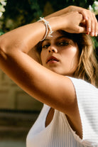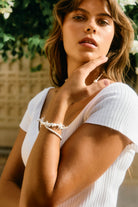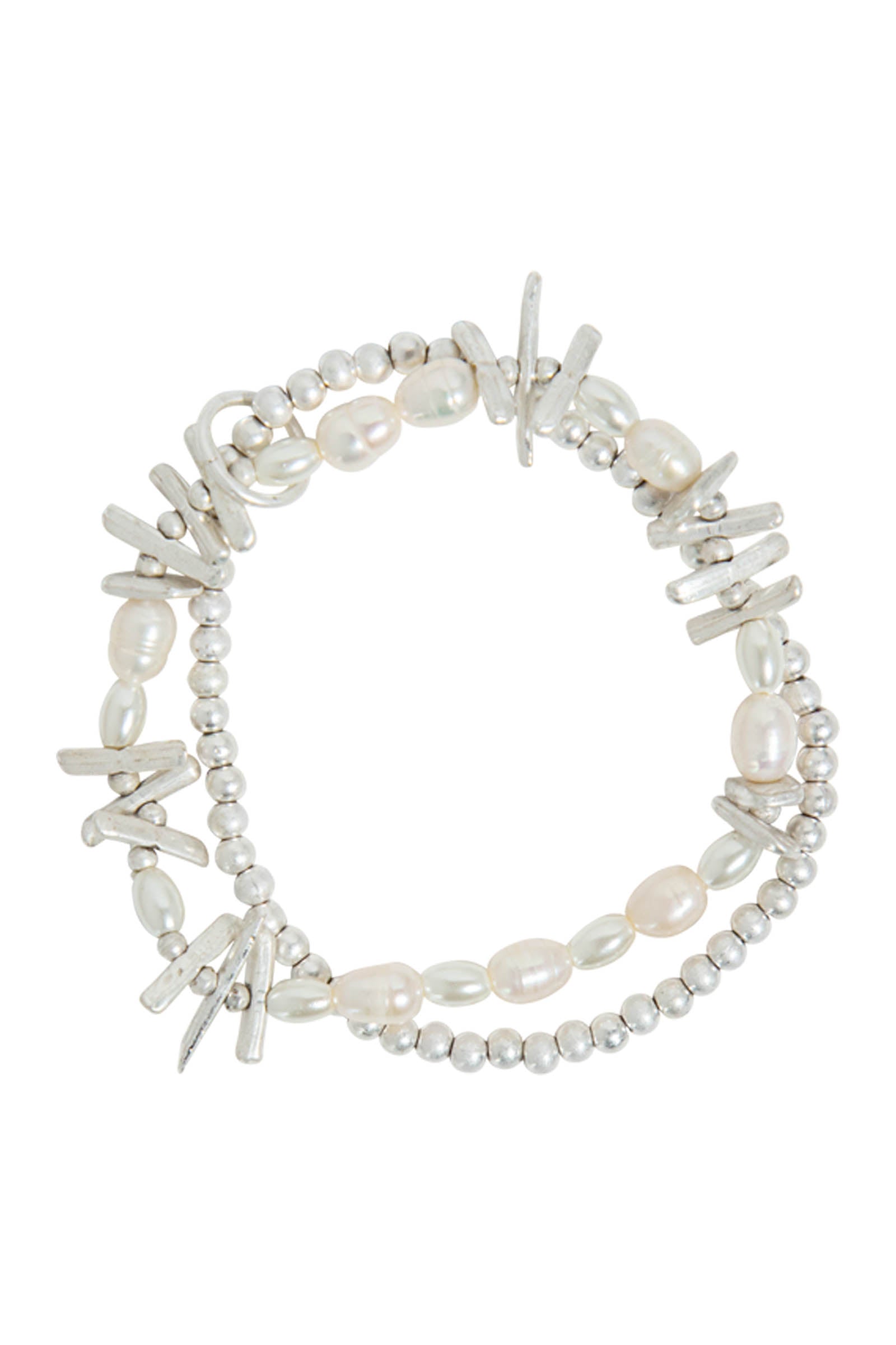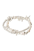 A layered mix of freshwater pearls and silver-toned beads in an organic beach-found style. Each piece in this bracelet set has its own texture, combining into a relaxed yet polished statement.