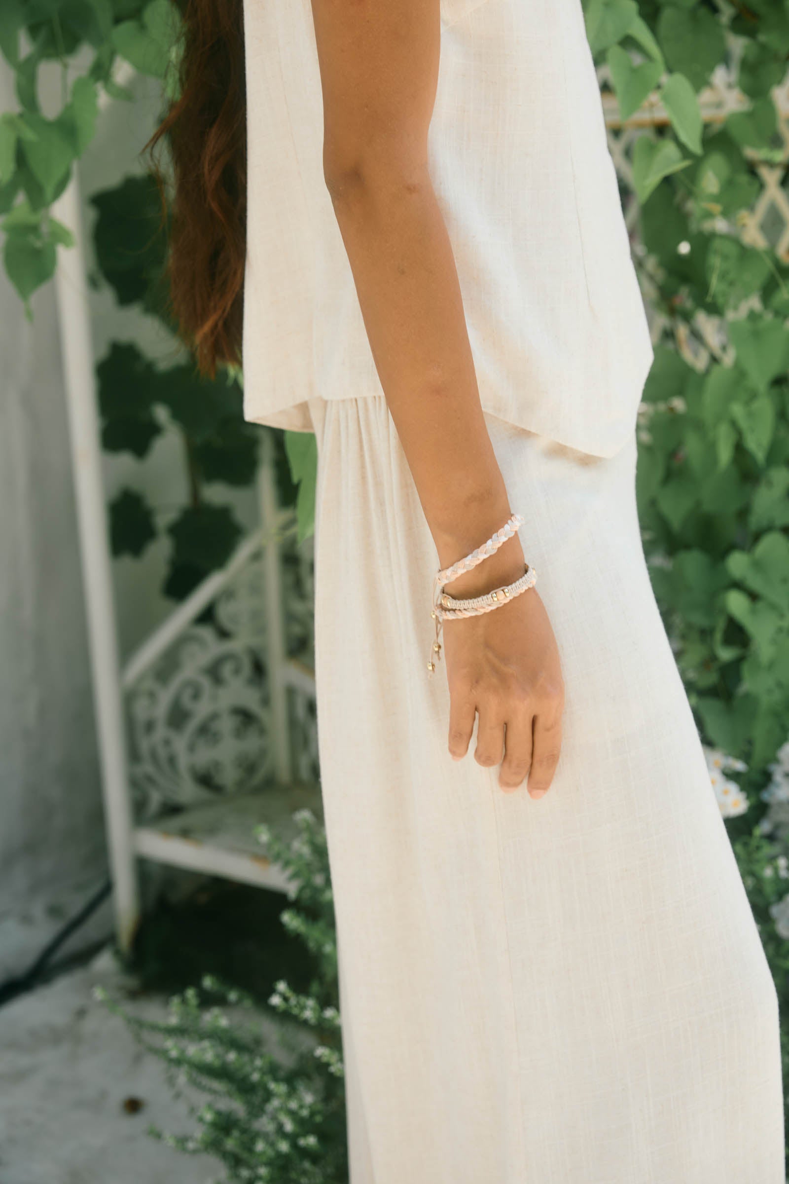 Designed for easy layering, the Nouveau Bracelet Set includes three woven bands adorned with flat and metallic beads. Adjustable to suit your fit and mood.