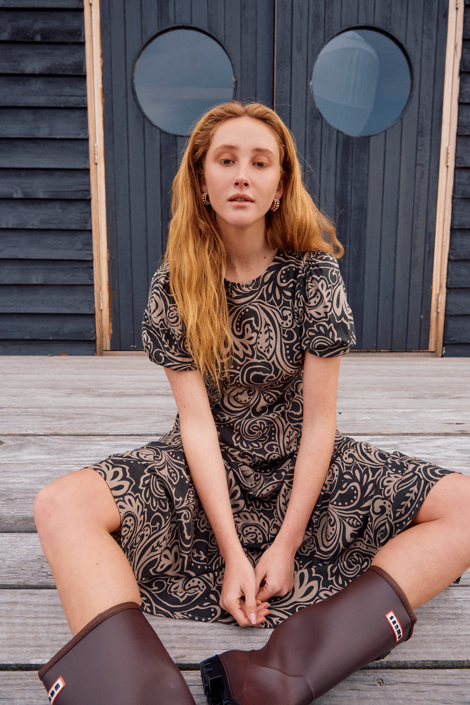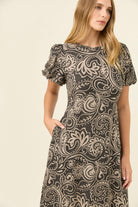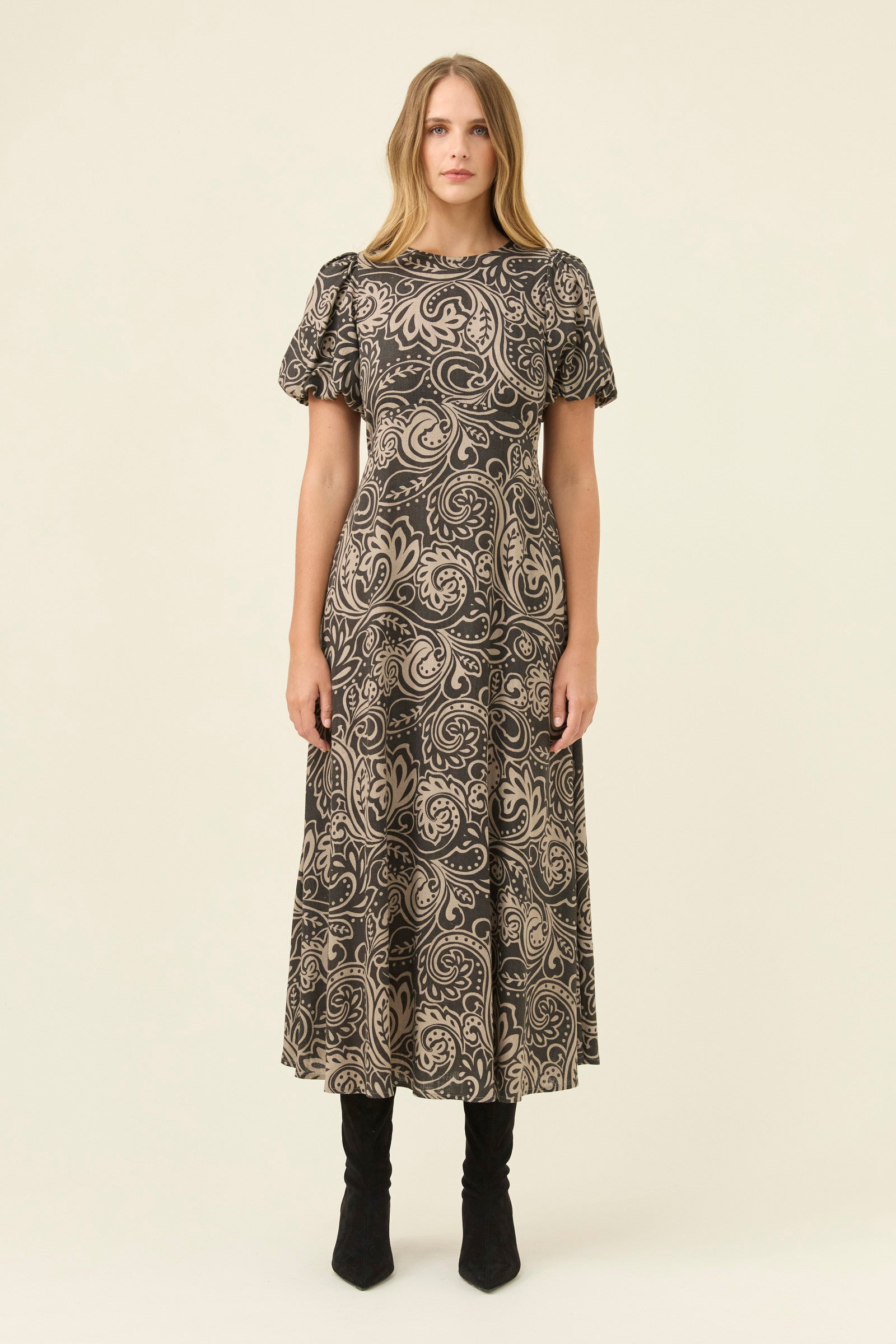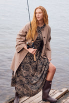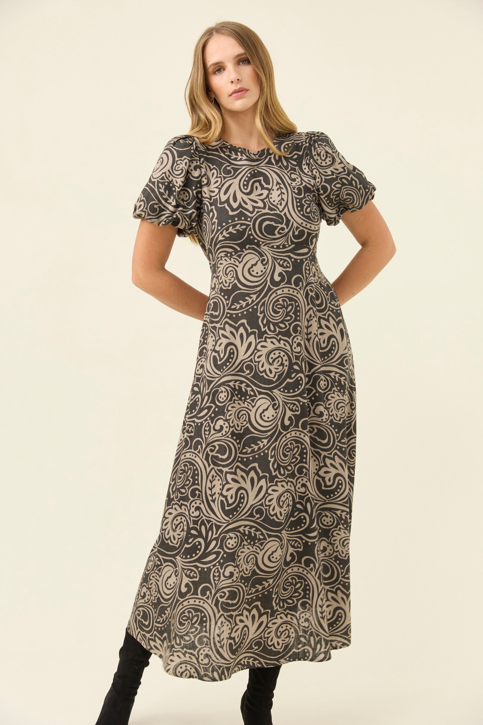 A flowing maxi dress with an empire line shape that feels soft and flattering. The round neckline opens at the back with a keyhole button, while puff sleeves are lined and gently elasticated for comfort. Shirring at the back waist brings ease to the fit, finished with practical side pockets.