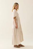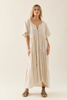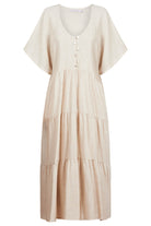 A breezy full-length maxi dress in a breathable linen blend. Designed with a round neckline, alternating shell buttons and loop closures down the front, and short raglan sleeves. Gently gathered tiers create a flattering relaxed silhouette.