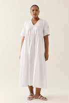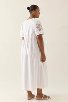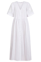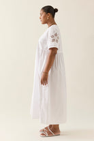 Looking for the perfect summer dress? The Nilsa Dress has arrived. Crafted in breathable cotton poplin with delicate cutwork embroidery and ladder lace, this button-through style balances structure with softness.