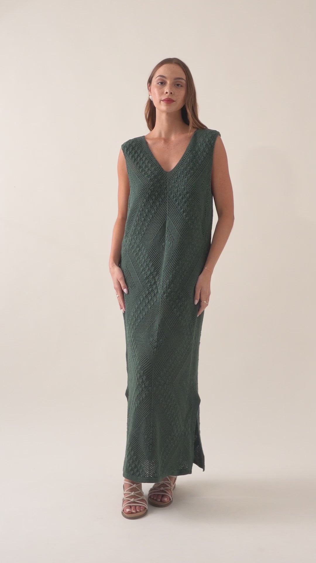 A sleeveless summer knit with laid-back polish, the Sylvie Dress features a flattering V-neckline, side splits and subtle diamond texture. Its 7/8 length makes it perfect for day-to-night ease.