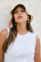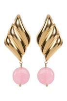 These drop earrings feature a diamond shaped golden swirl motif paired with a soft pink stone bead. Artistic with a gentle edge.