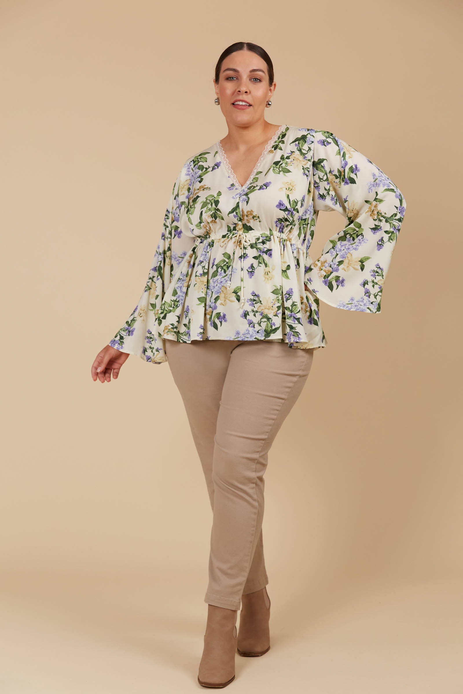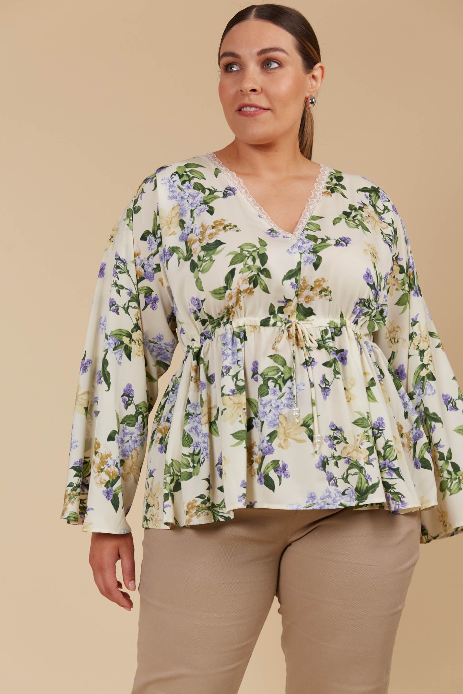 Crafted with a silky smooth texture, the Maia Relaxed Top is a chic staple for your winter wardrobe. Its graceful V-neckline, adorned with lace trim, and flowing bell sleeves lends a touch of elegance. The adjustable drawstring waist offers a custom fit that accentuates your shape beautifully. Perfect for an evening dinner or a stylish gathering, the Maia Relaxed Top pairs seamlessly with tailored trousers for a polished, timeless ensemble.