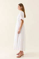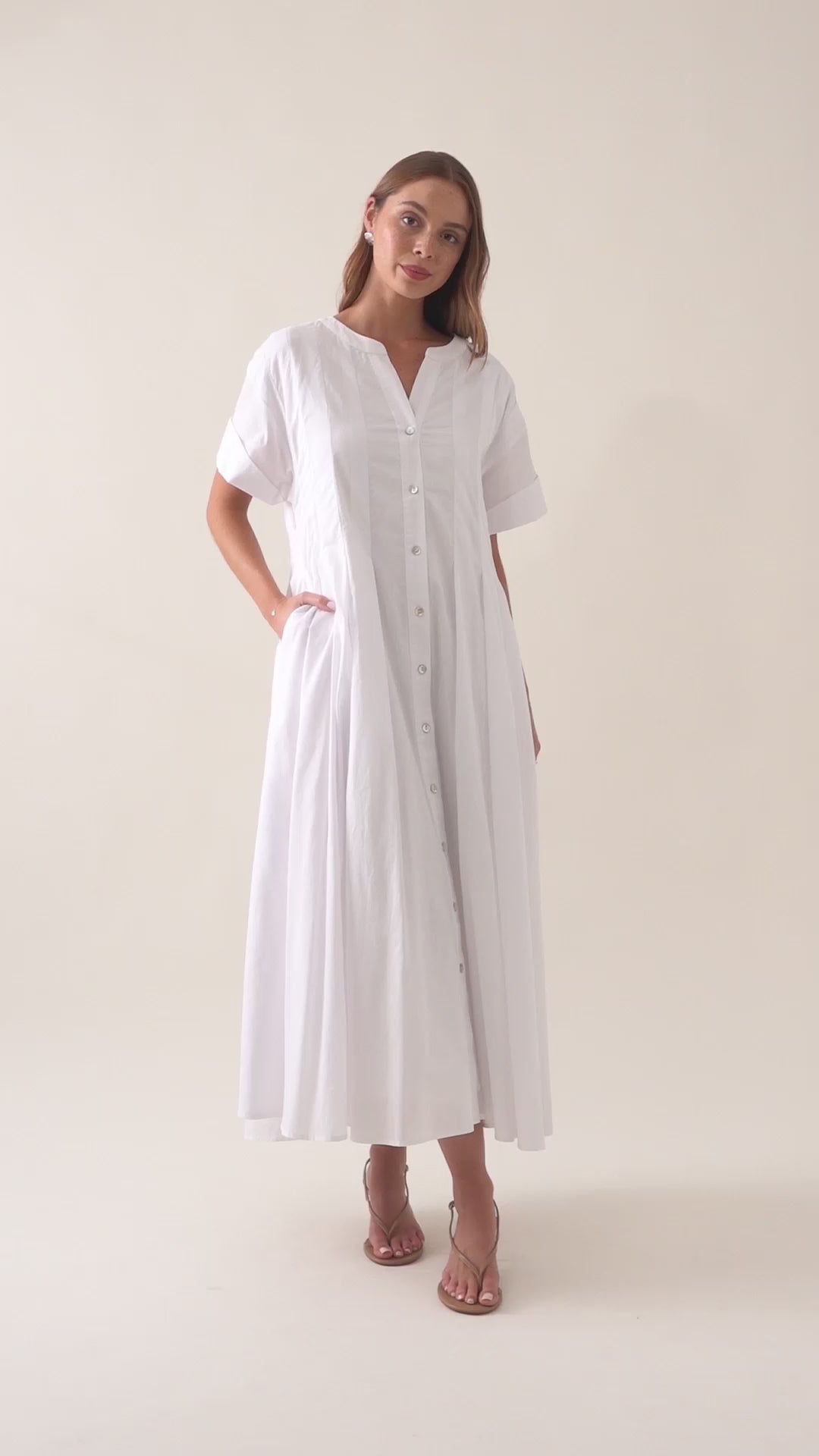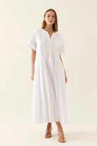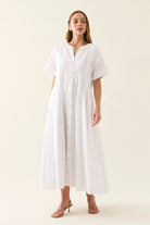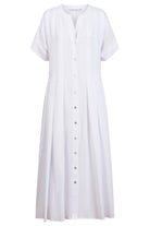 The Aurora Pleat Maxi is a breezy cotton voile maxi dress with soft pleat details and a functional button-down front. It features short sleeves with cuffed hems and practical side pockets.