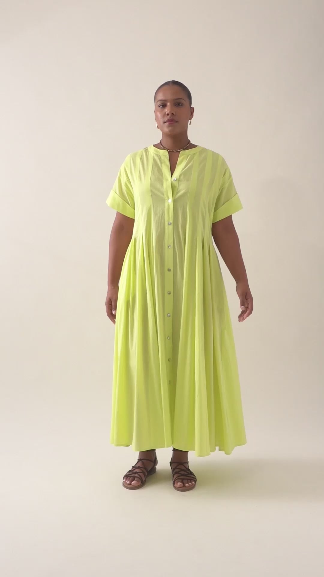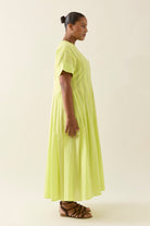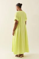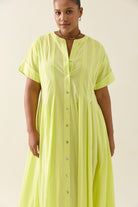 The Aurora Pleat Maxi is a breezy cotton voile maxi dress with soft pleat details and a functional button-down front. It features short sleeves with cuffed hems and practical side pockets.