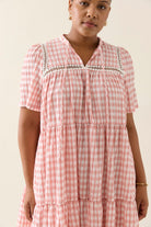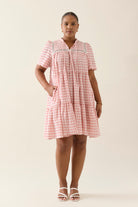 An easy-going style with refined detail, the Esther Dress is made from seersucker textured cotton blend and features lace inserts on the yoke, a high V-neckline with ties, and three gathered tiers for a soft drape.