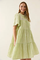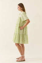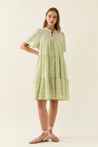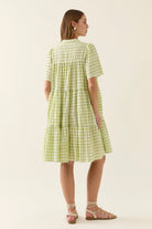 An easy-going style with refined detail, the Esther Dress is made from seersucker textured cotton blend and features lace inserts on the yoke, a high V-neckline with ties, and three gathered tiers for a soft drape.