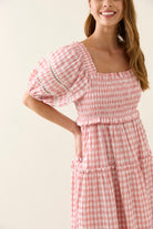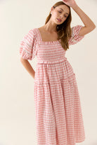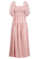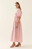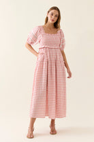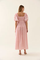 A flowing silhouette made for comfort and ease, the Esther Shirred Maxi is crafted in textured gingham seersucker with a square neckline, elasticated shirring at the bust and puff sleeves trimmed with lace.