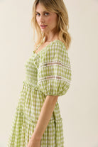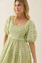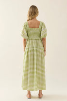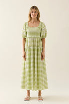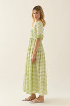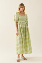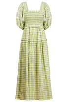 A flowing silhouette made for comfort and ease, the Esther Shirred Maxi is crafted in textured gingham seersucker with a square neckline, elasticated shirring at the bust and puff sleeves trimmed with lace.