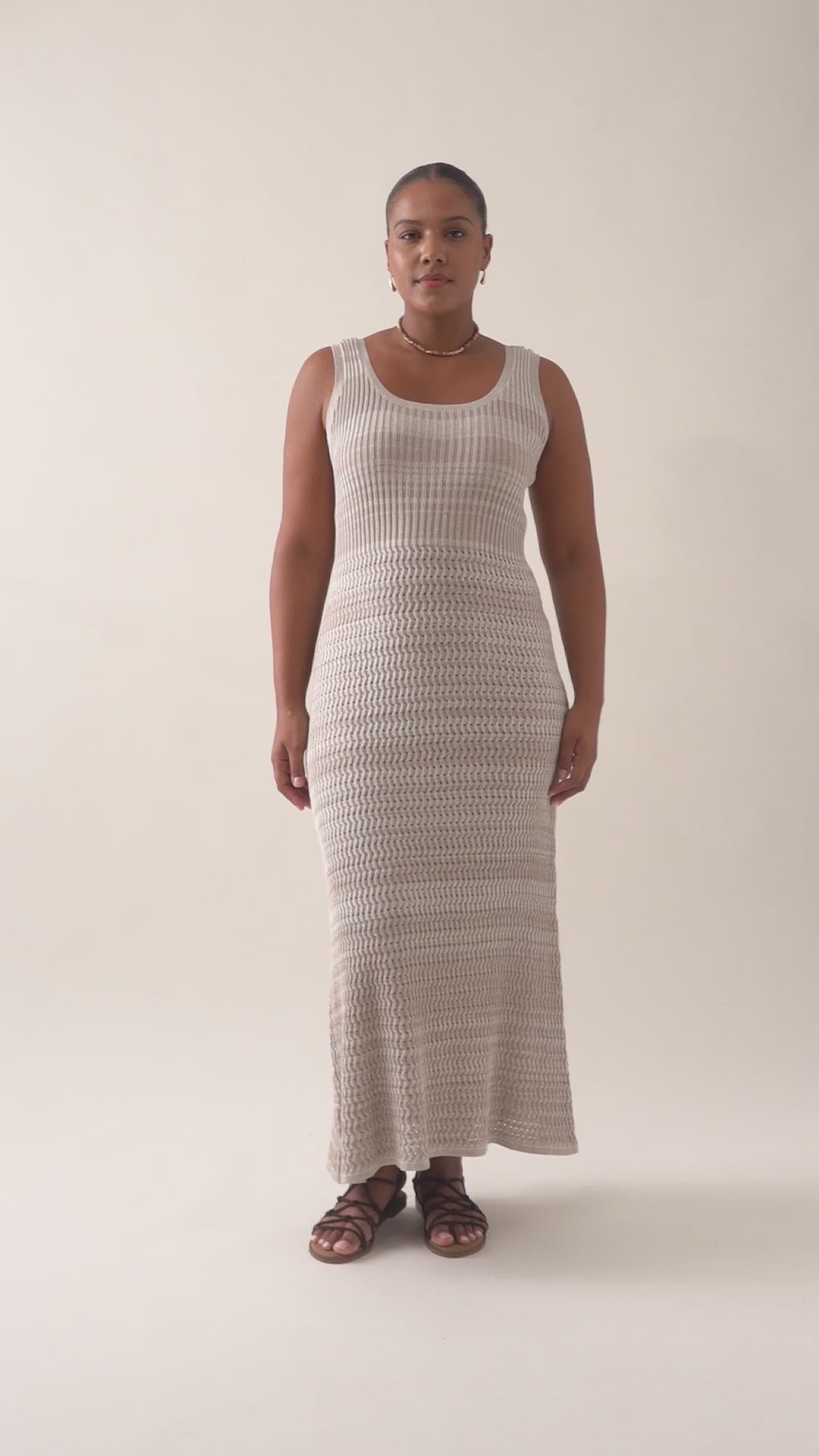 A textural pointelle-knit dress crafted from 100% cotton. This 7/8-length dress features mixed two-tone woven fibres for visual depth, a rounded neckline, and a softly flared mermaid-style hem. This dress offers subtle glimpses of skin.