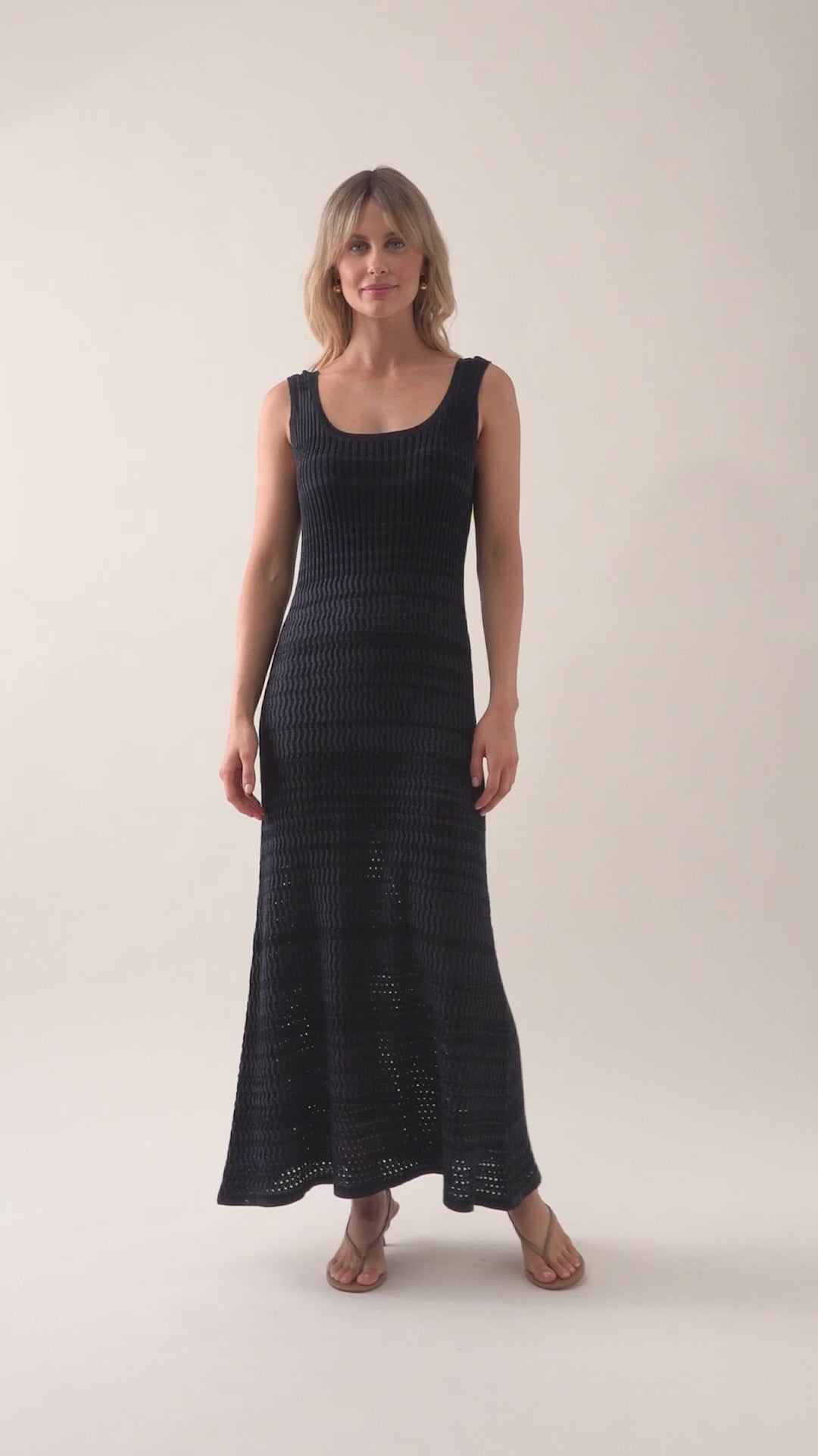 A textural pointelle-knit dress crafted from 100% cotton. This 7/8-length dress features mixed two-tone woven fibres for visual depth, a rounded neckline, and a softly flared mermaid-style hem. This dress offers subtle glimpses of skin.