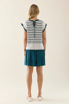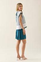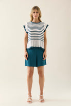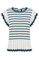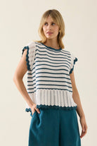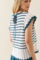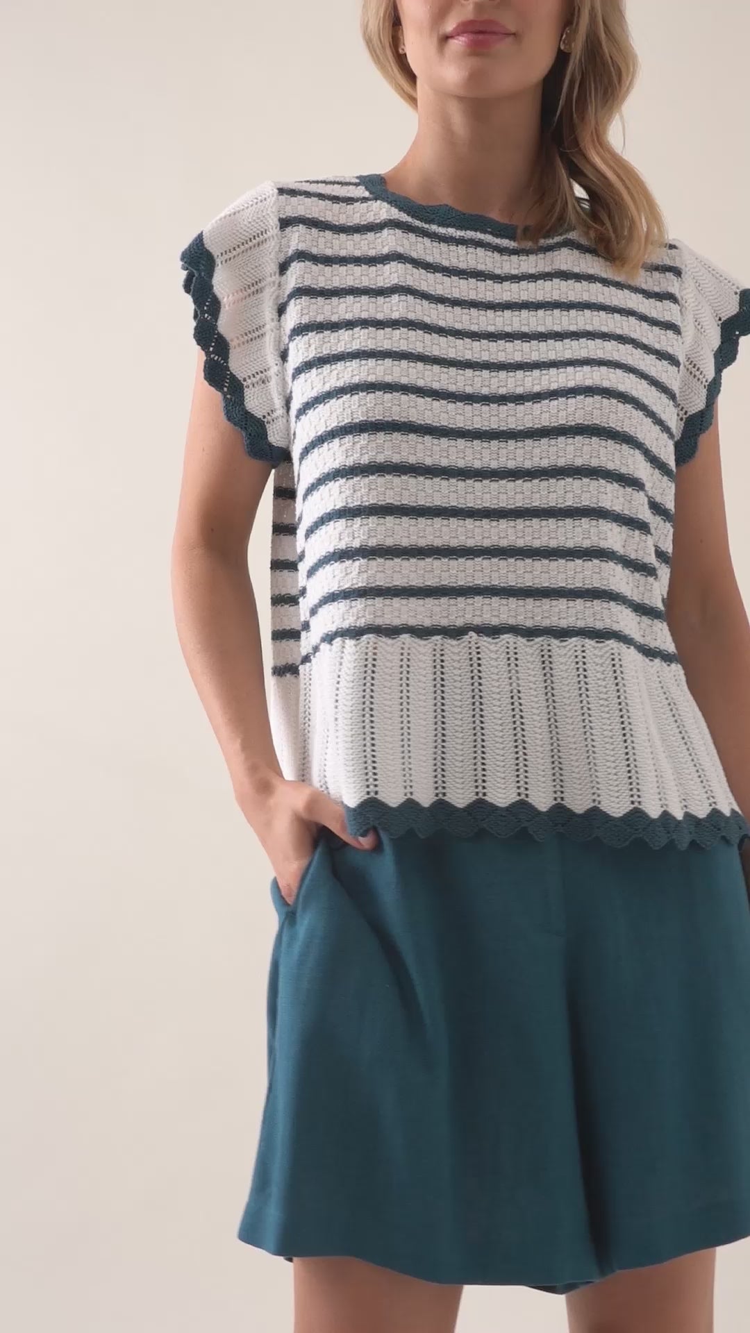 A lightweight knit crafted from 100% cotton with pointelle texture and fine horizontal stripe detail. The relaxed fit features scallop edging at the sleeves, hem, and neckline, finished with a back keyhole and tie detail.