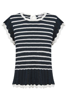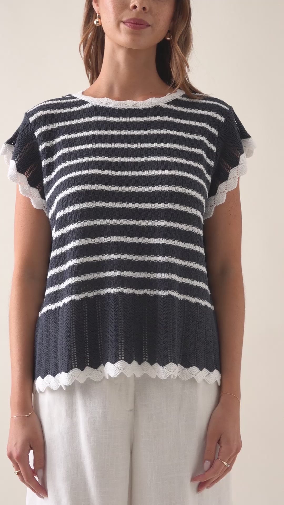 A lightweight knit crafted from 100% cotton with pointelle texture and fine horizontal stripe detail. The relaxed fit features scallop edging at the sleeves, hem, and neckline, finished with a back keyhole and tie detail.