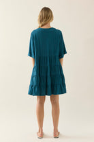A relaxed, go-to summer dress in a soft linen blend. Features a flattering V-neckline, shell button front, short sleeves with fixed cuffs, and gathered tiers that fall effortlessly to a relaxed shape. Includes internal side pockets for everyday ease.