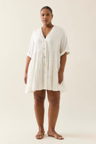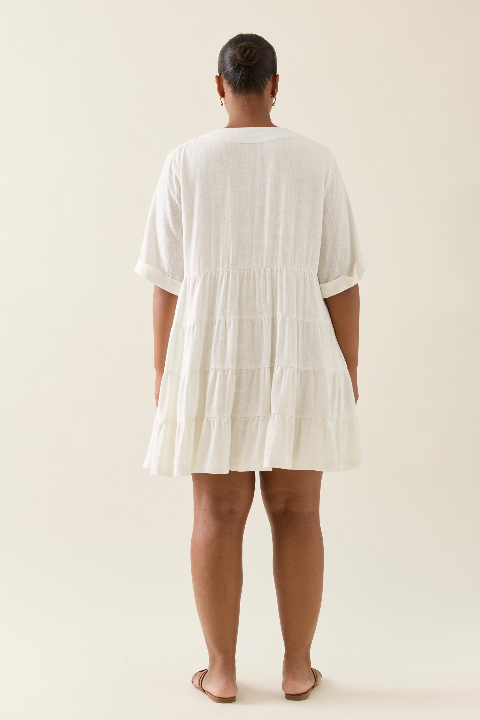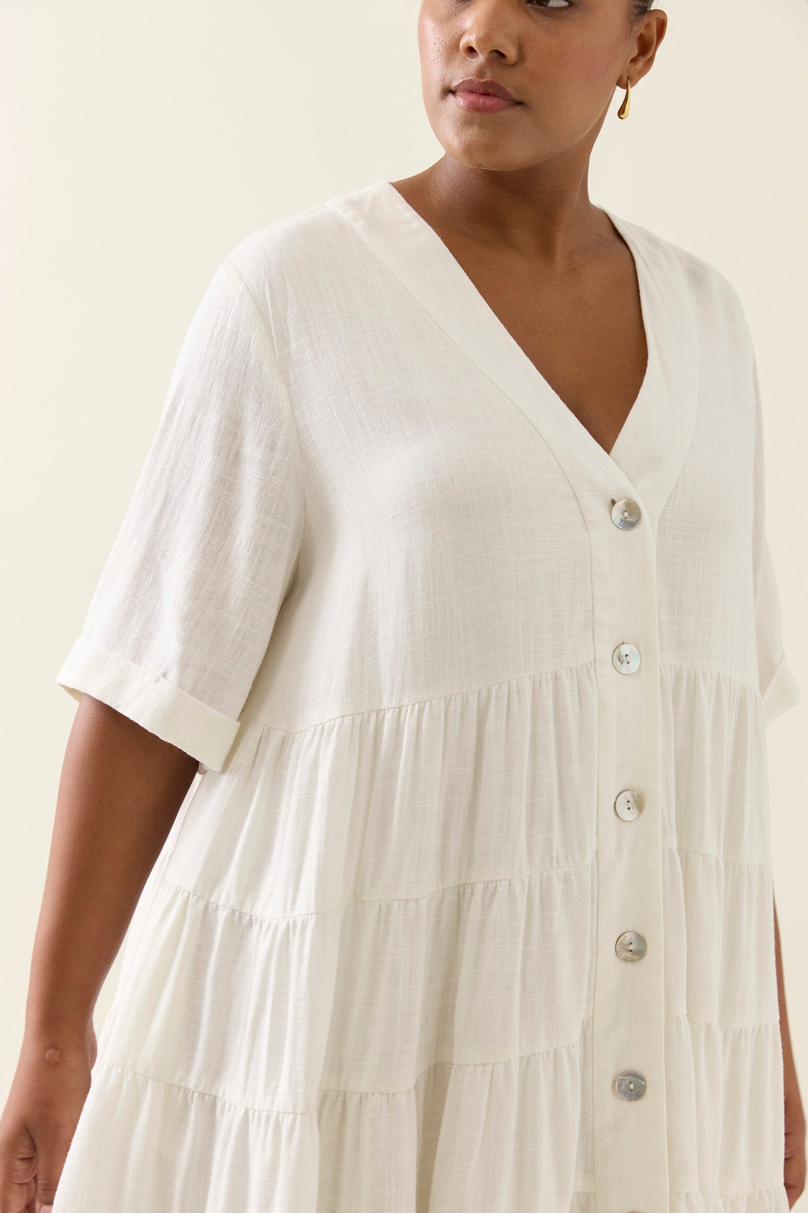 A relaxed, go-to summer dress in a soft linen blend. Features a flattering V-neckline, shell button front, short sleeves with fixed cuffs, and gathered tiers that fall effortlessly to a relaxed shape. Includes internal side pockets for everyday ease.
