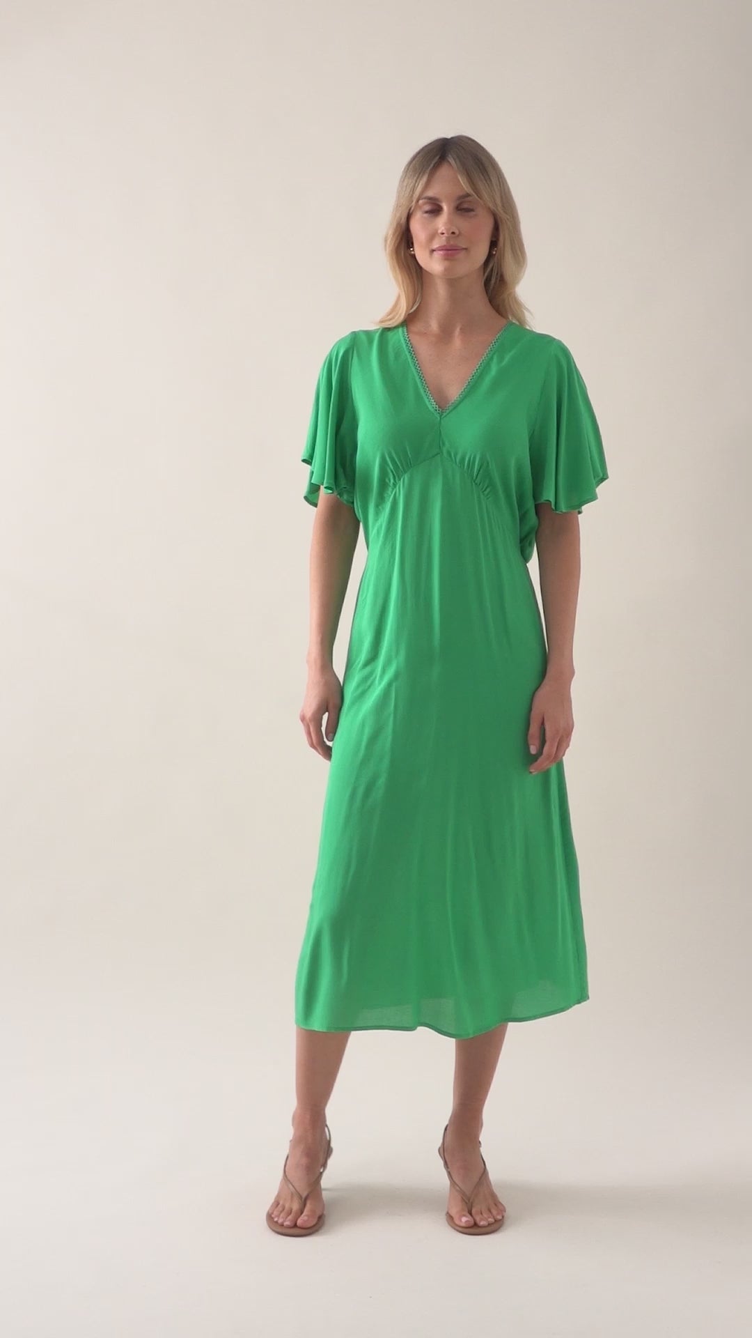 Feminine, functional and flowing, the Oline Midi Dress is crafted to flatter with a gathered bust, adjustable waist ties and soft flutter sleeves. An effortless choice for weekend plans.