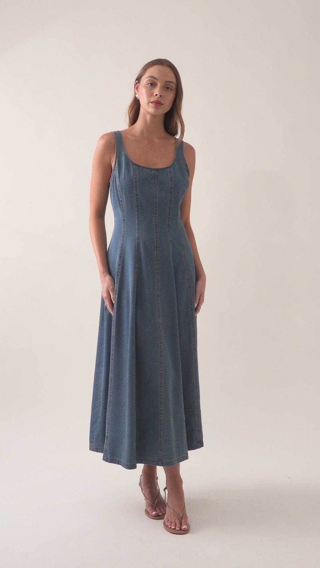 The Sofie Denim Tank Dress is structured yet breathable, crafted from 100% cotton denim with a flattering A-line cut and shaped panels. A 7/8 length and exposed centre back zip make this piece easy to wear from day to night.
