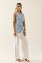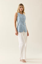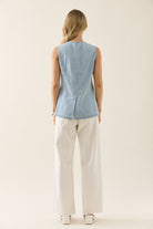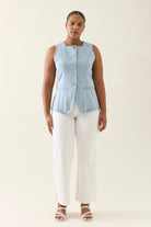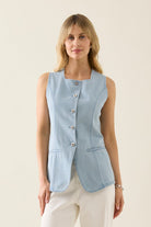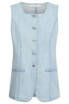 Tailored for a flattering silhouette, the Sofie Denim Vest is crafted from lightweight 100% cotton denim. Features a high square neckline, shaped panel seams, button-through front and faux welt pockets.