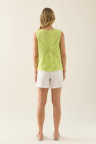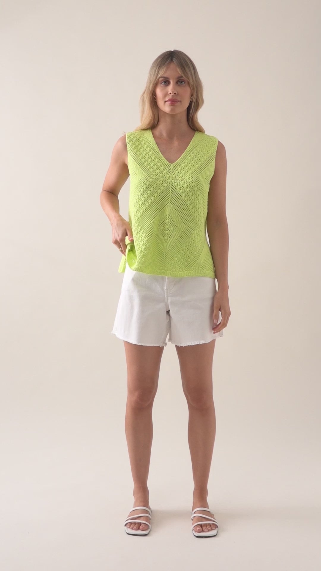 The Sylvie Top is a sleeveless knit with subtle texture and a flattering V-neckline. With a side split hem and diamond pattern finish, it blends structure with softness.