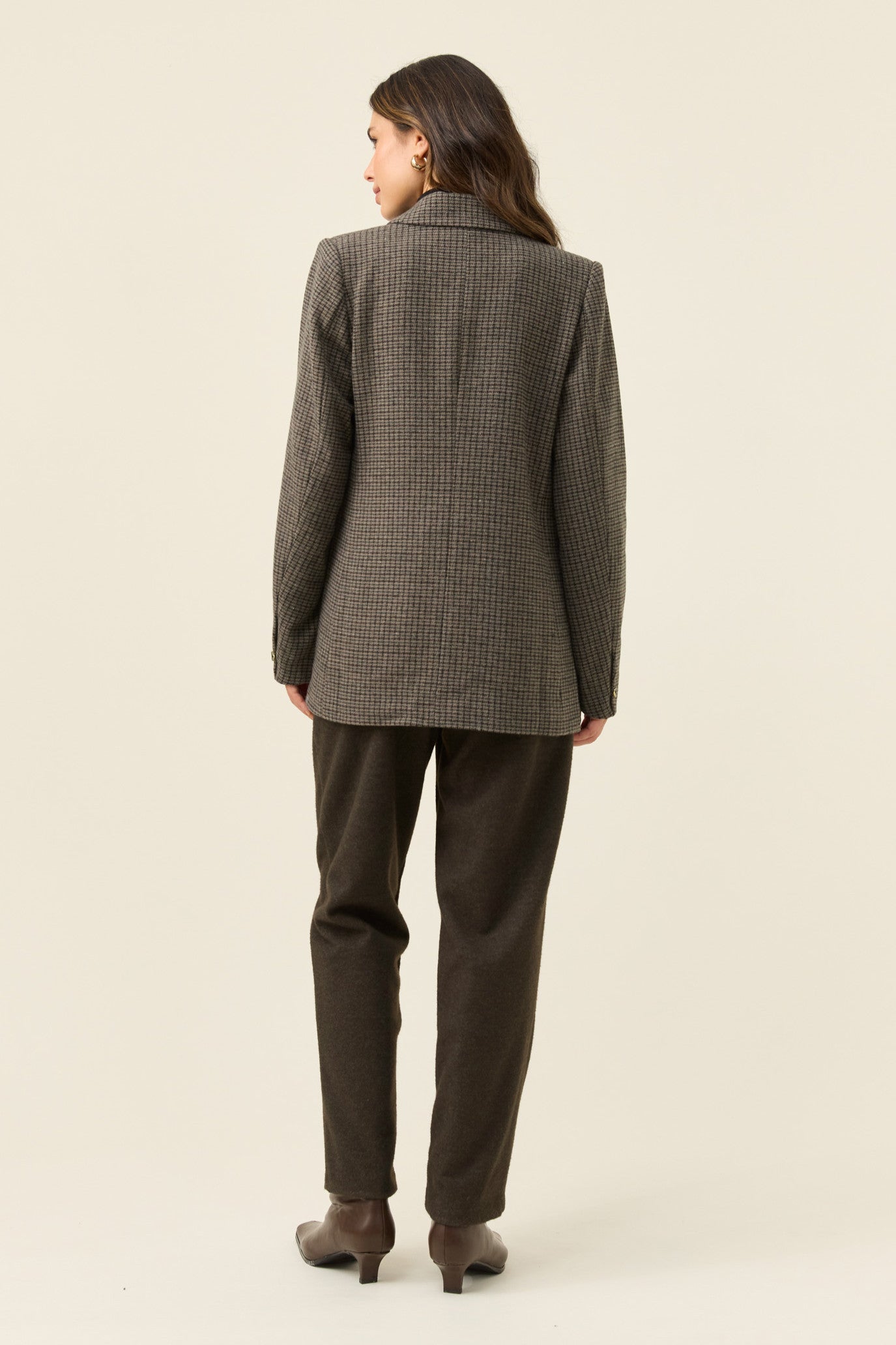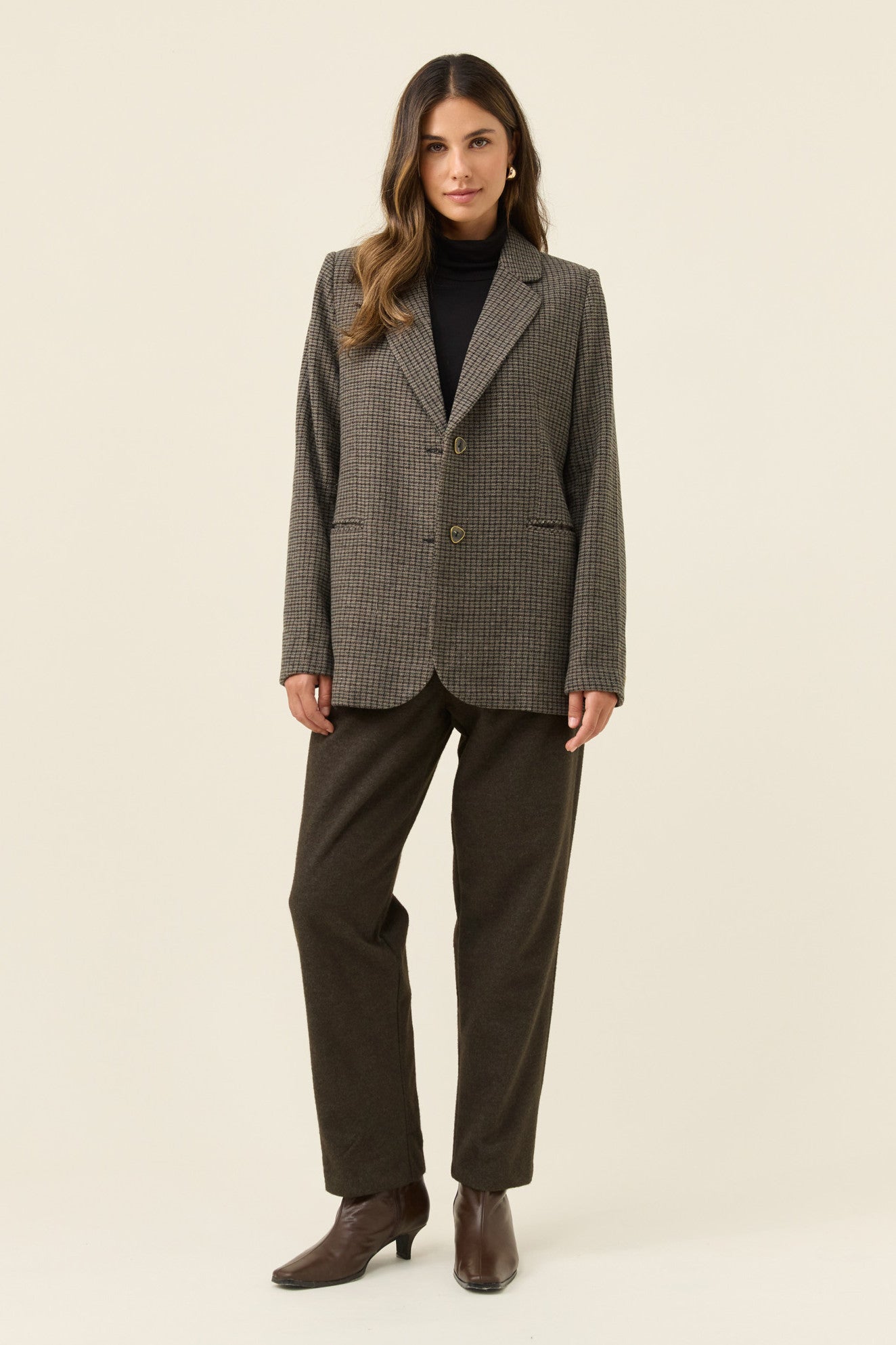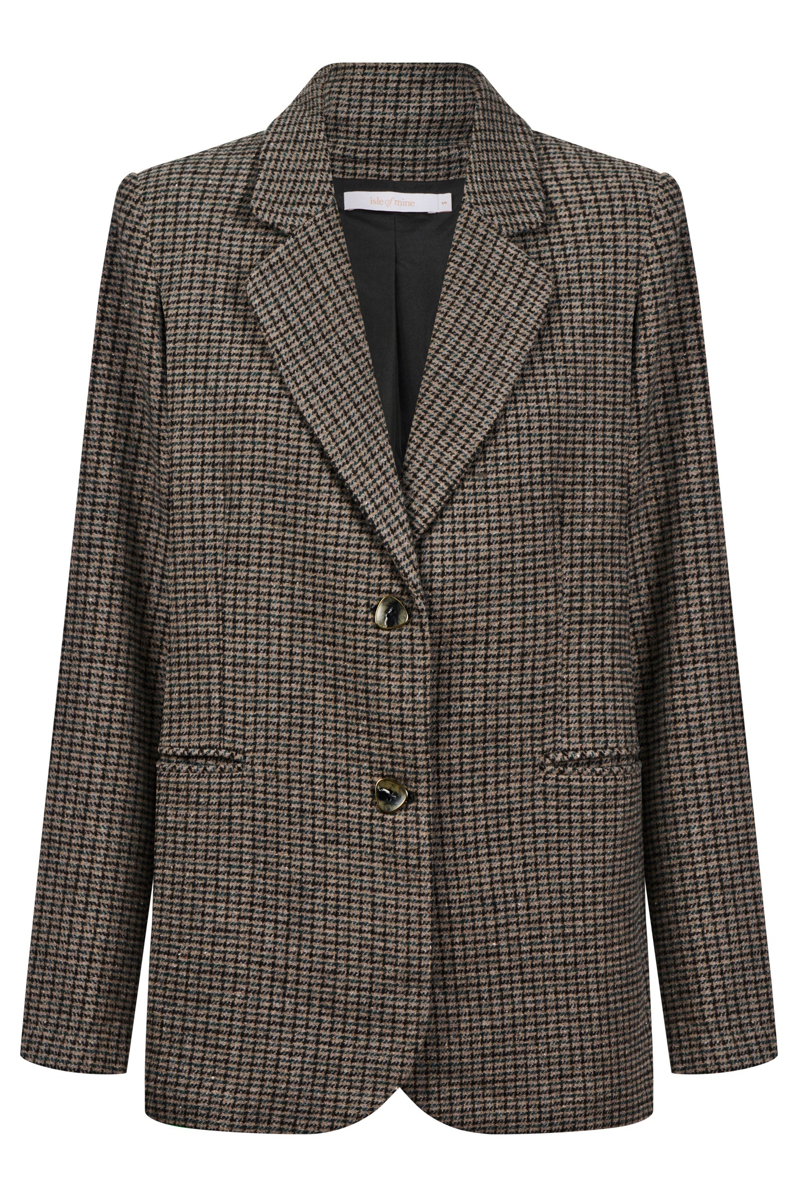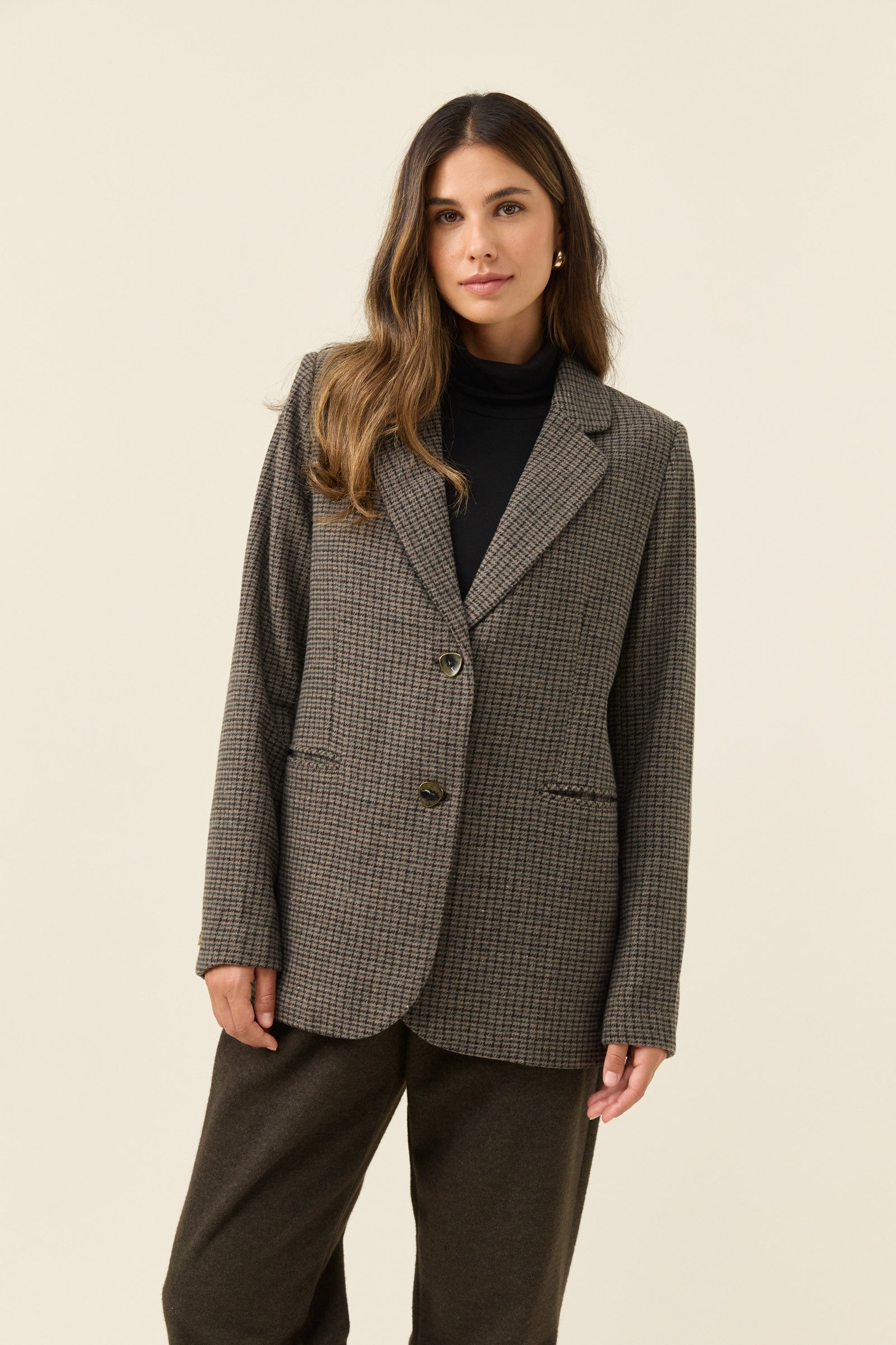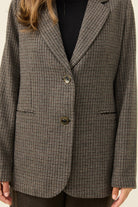 A classic houndstooth blazer cut in soft suiting fabric and fully lined for comfort. The notched lapel, diamond-shaped buttons and welt pockets bring a timeless tailored feel, while subtle shoulder padding adds light structure.