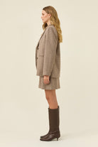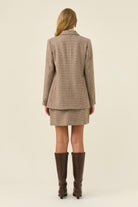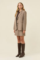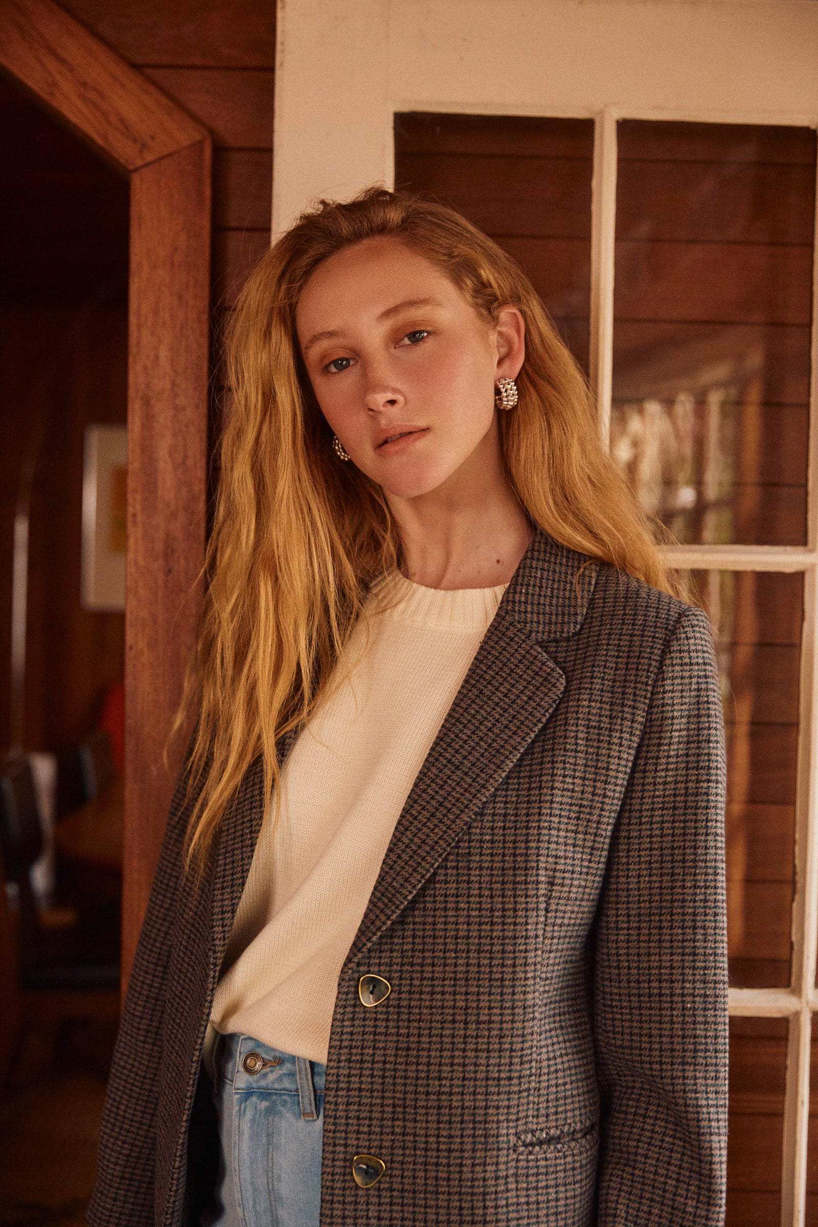 A classic houndstooth blazer cut in soft suiting fabric and fully lined for comfort. The notched lapel, diamond-shaped buttons and welt pockets bring a timeless tailored feel, while subtle shoulder padding adds light structure.