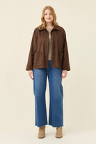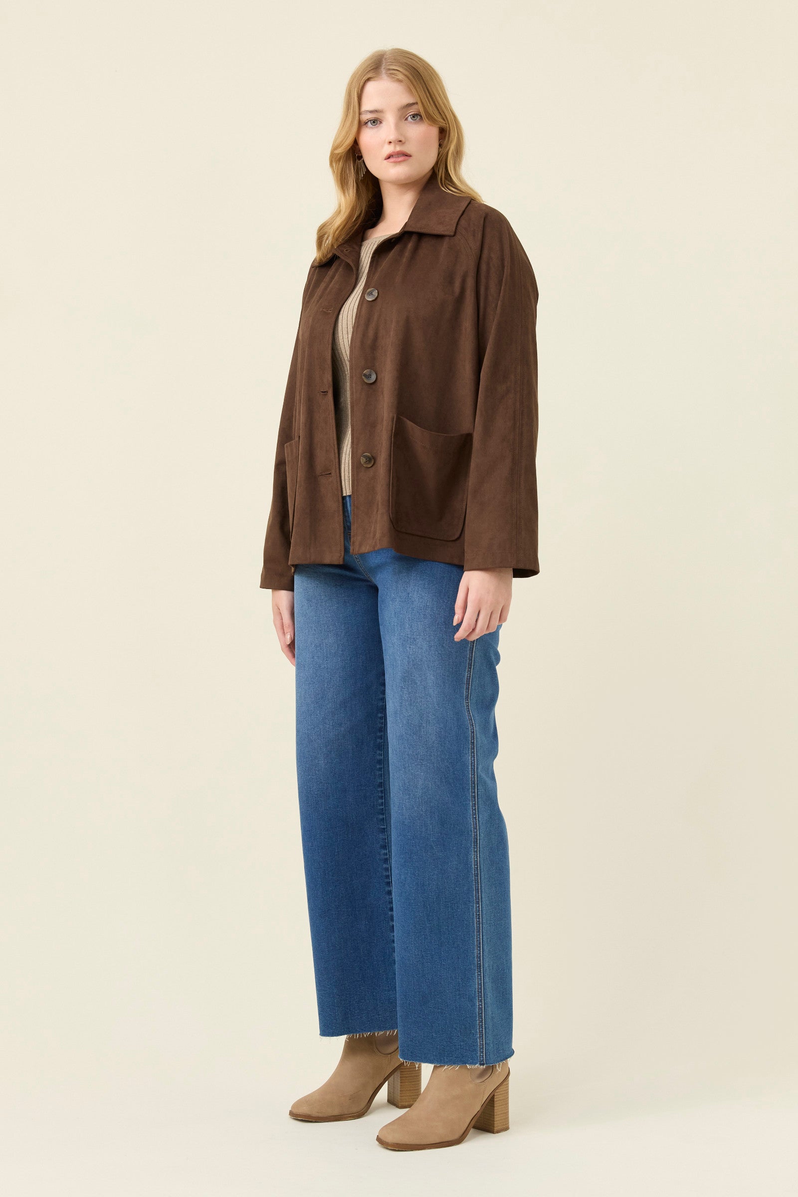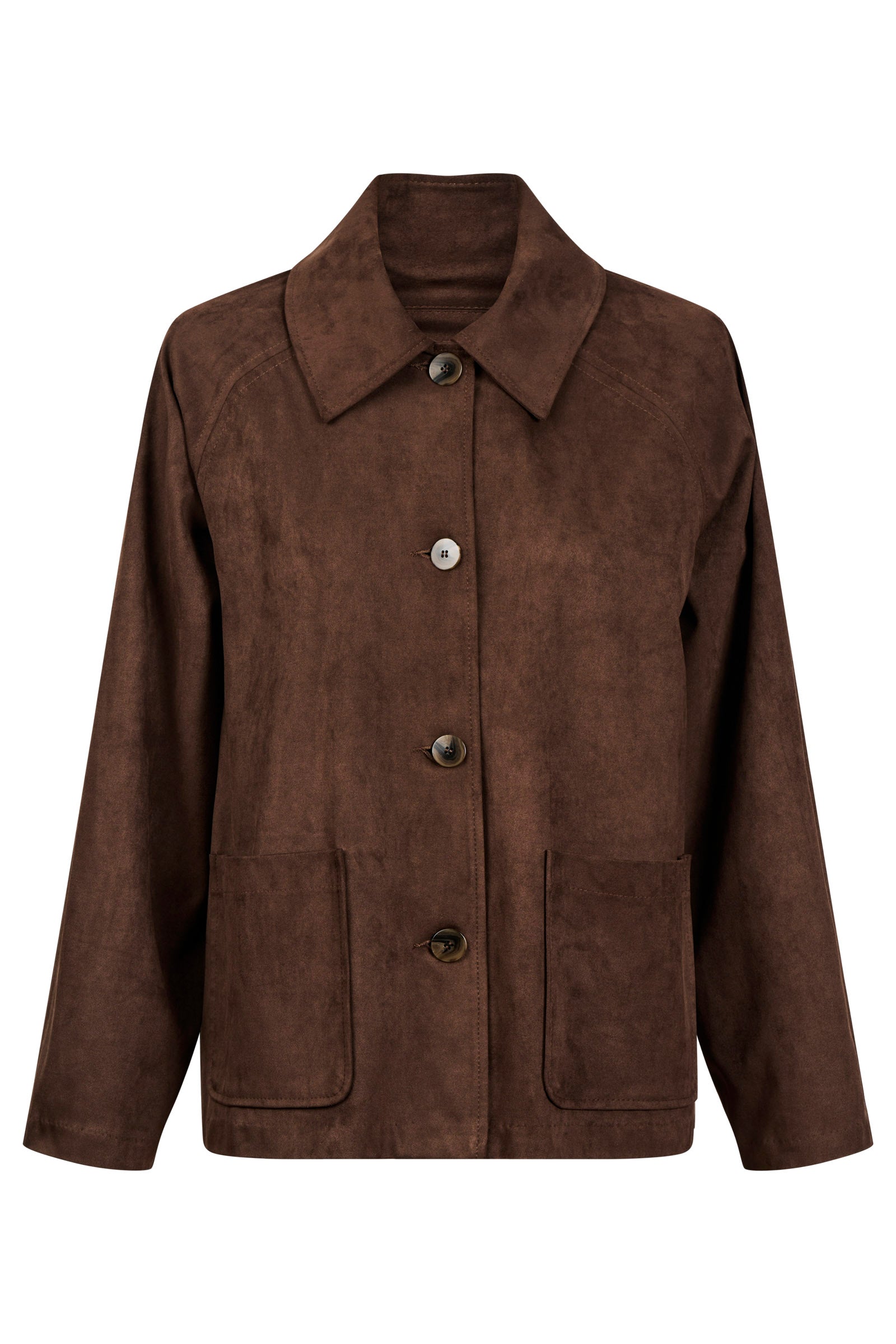 A soft, suede-effect jacket with a gentle drape and a warm hand-feel. The patch pockets and tortoise shell buttons add natural texture, while the collar and full sleeves keep the shape classic and easy to layer.