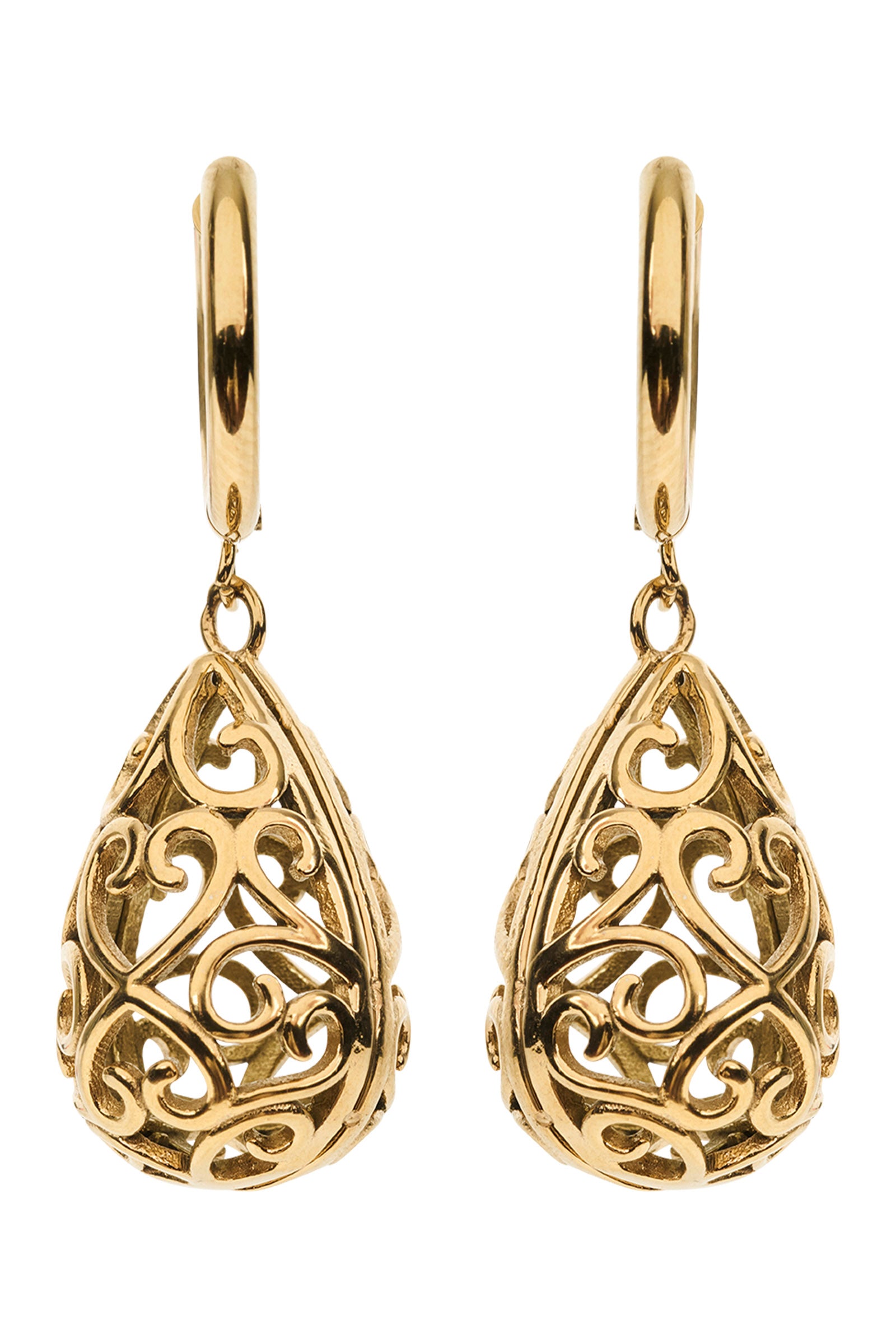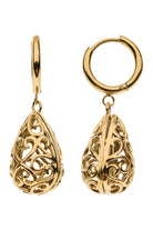 An ornate earring with a softly antique feel. Twirling gold patterns bring a romantic, floral-inspired finish.