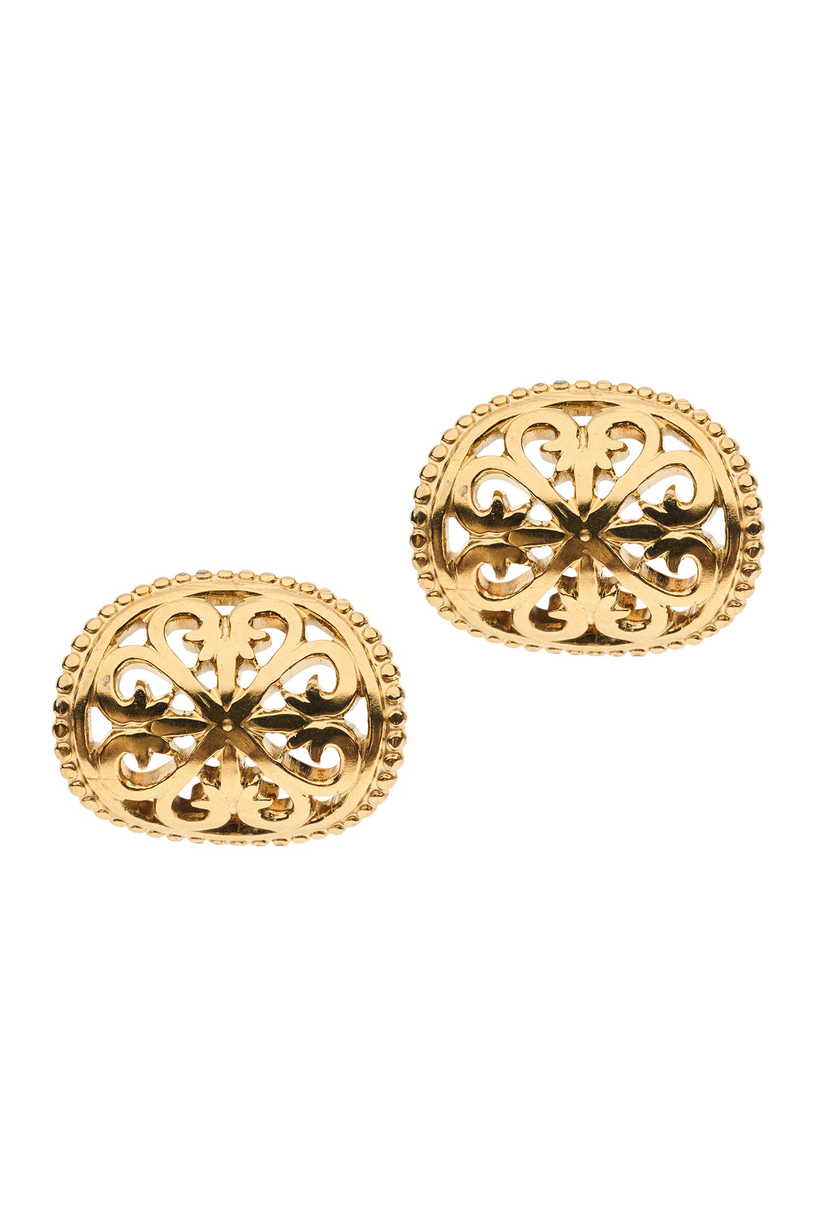 An ornate earring with a softly antique feel. Twirling gold patterns bring a romantic, floral-inspired finish.