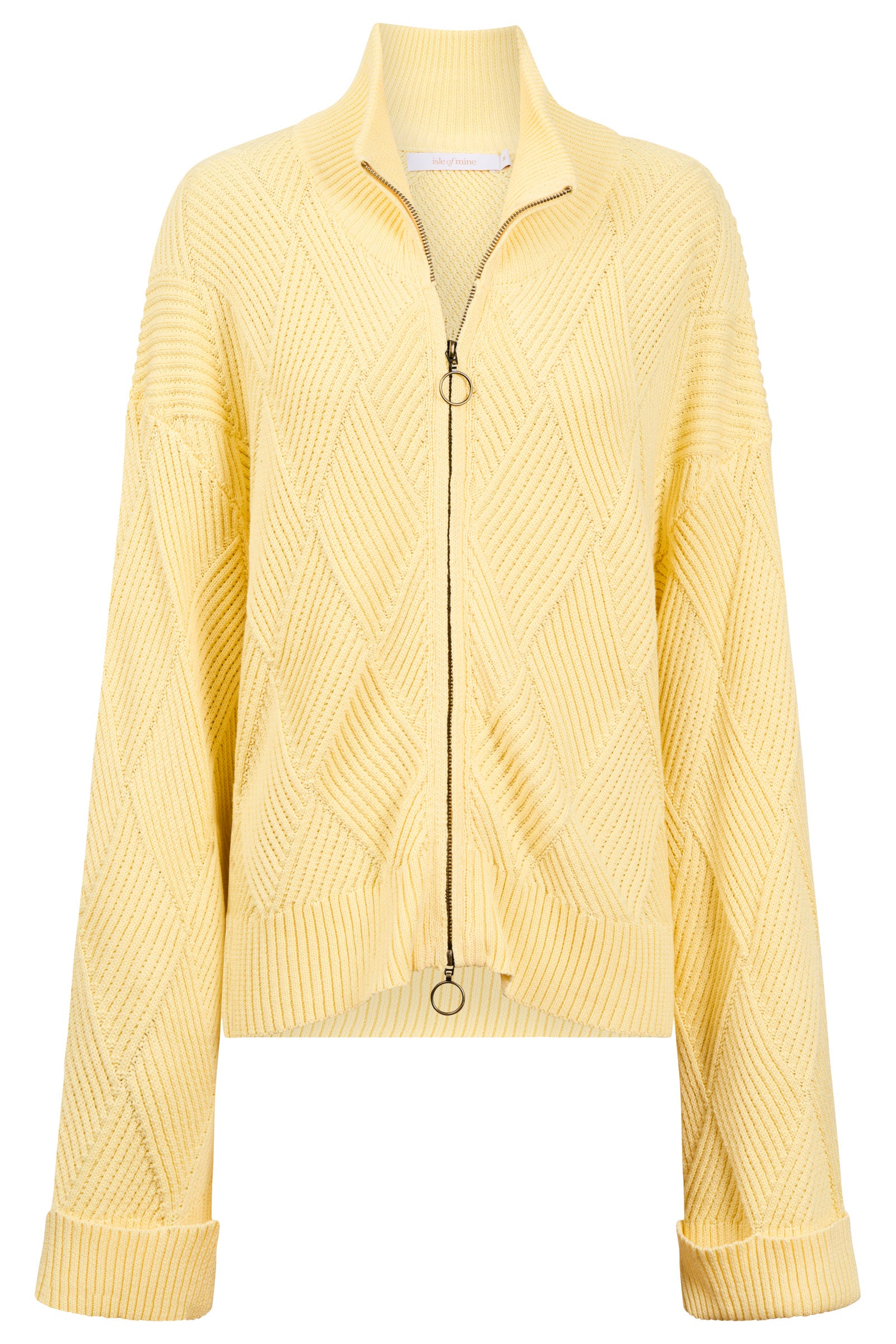 A cotton jumper with a diagonal rib knit pattern that gives subtle movement and texture. The high neckline and double-ended zipper allow you to adjust the shape, while the fixed cuffs keep the silhouette neat and easy to layer.