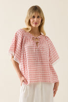 A soft and feminine blouse crafted in a textured gingham seersucker. Designed with an elasticated shirred neckline, short sleeves finished with delicate lace trim, and a flexible fit that flatters a range of body shapes. Double tie details at the neckline allow you to customise your shape.