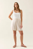 A flattering high-waist short in a breathable linen blend. Features a zip fly with shell button fastening, elasticated back waistband, and internal side pockets for practicality.