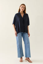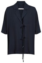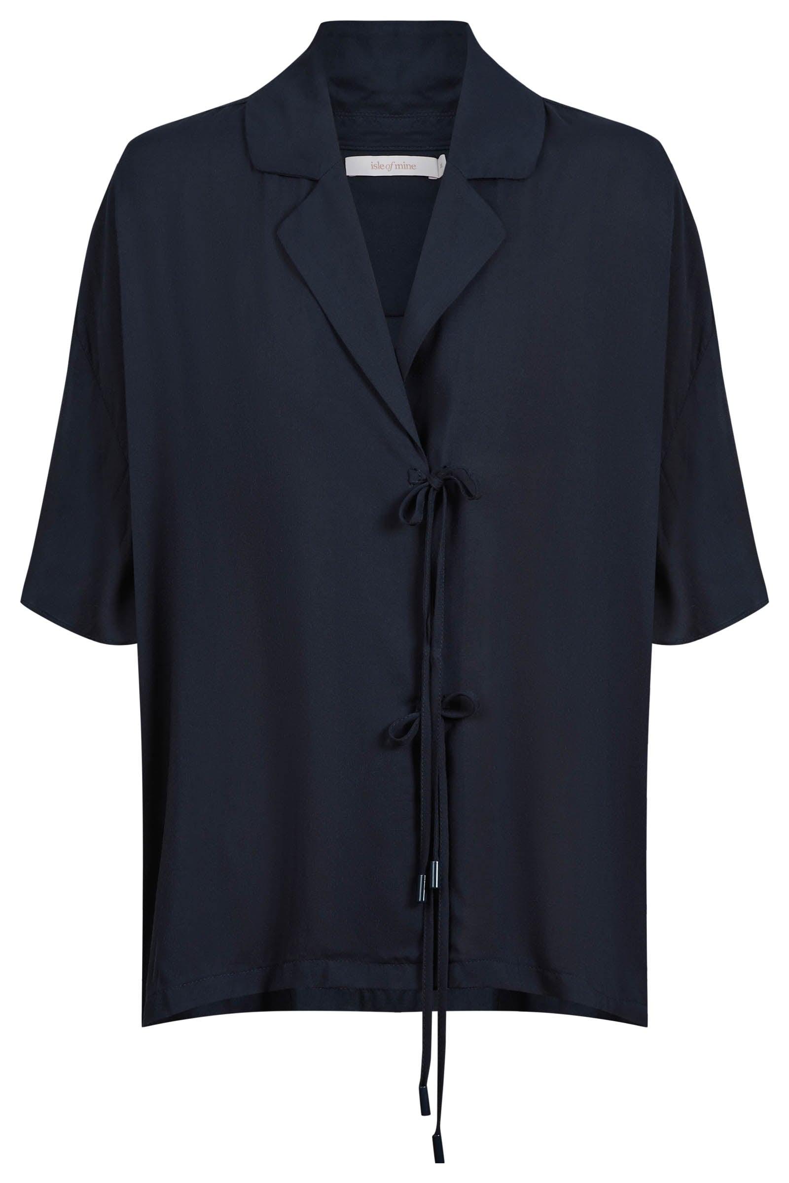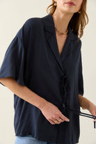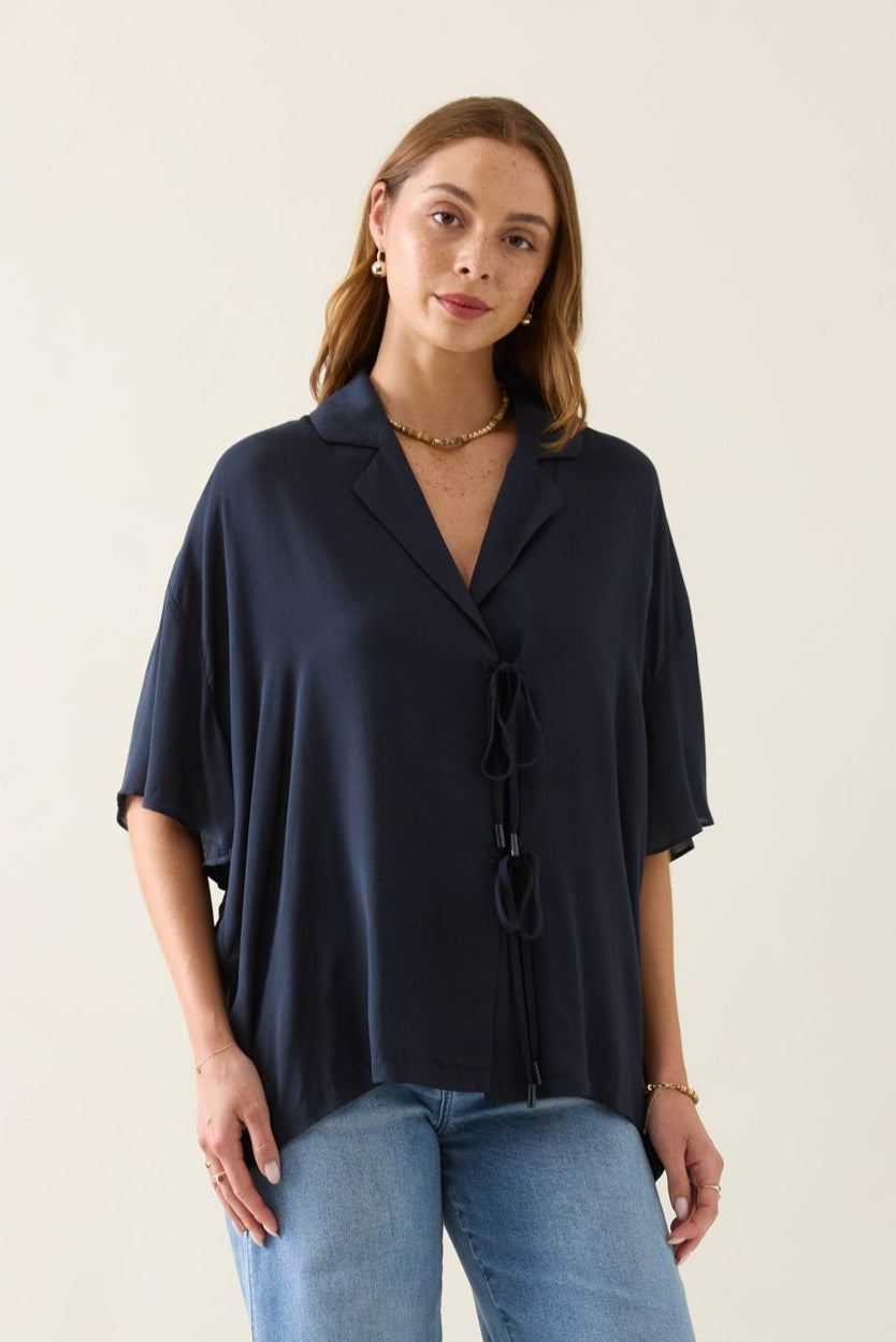 Laid-back and effortlessly elegant, the Oline Tie Shirt features a soft notched collar, short sleeves, and a playful double tie front closure.