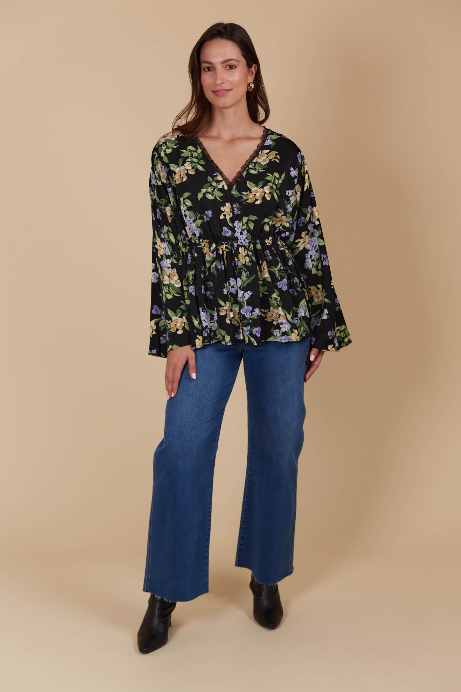 Crafted with a silky smooth texture, the Maia Relaxed Top is a chic staple for your winter wardrobe. Its graceful V-neckline, adorned with lace trim, and flowing bell sleeves lends a touch of elegance. The adjustable drawstring waist offers a custom fit that accentuates your shape beautifully. Perfect for an evening dinner or a stylish gathering, the Maia Relaxed Top pairs seamlessly with tailored trousers for a polished, timeless ensemble.