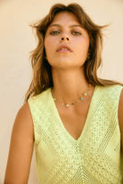 A delicate necklace featuring tiny colourful beads interspersed along a fine bar chain. Soft pinks, blues and greens lend it a natural charm.