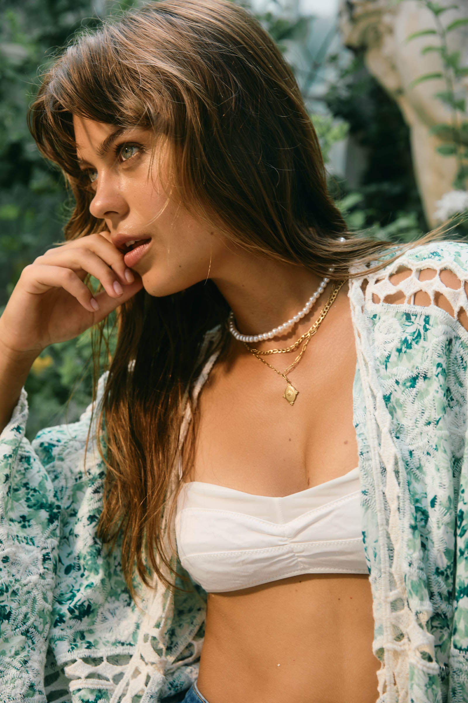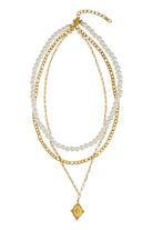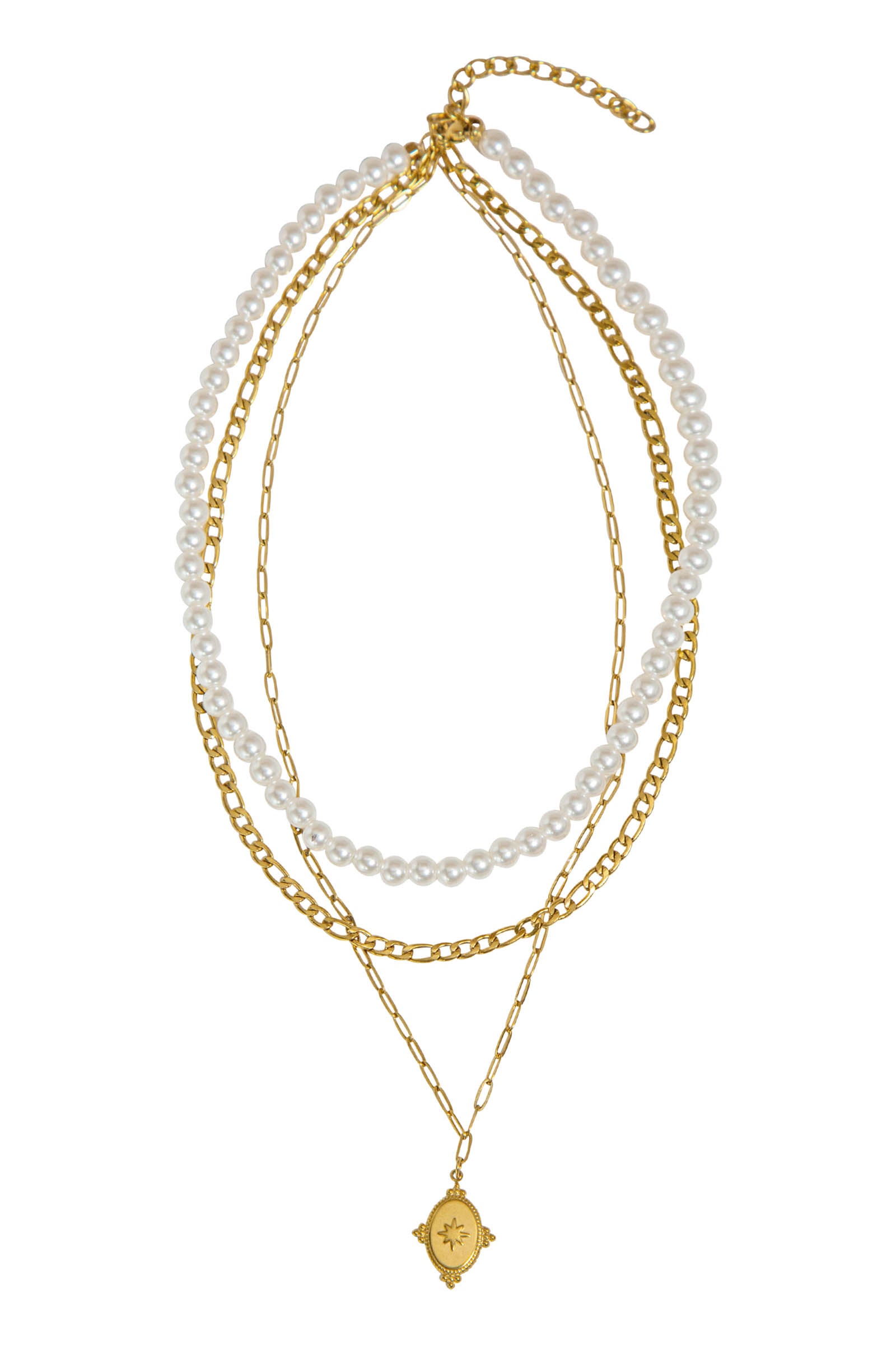 A layered necklace with three strands - a fine gold chain, imitation pearl strand, and a southern cross-style pendant. The perfect complement to the Ingrid Pearl Earring Pendant.