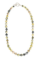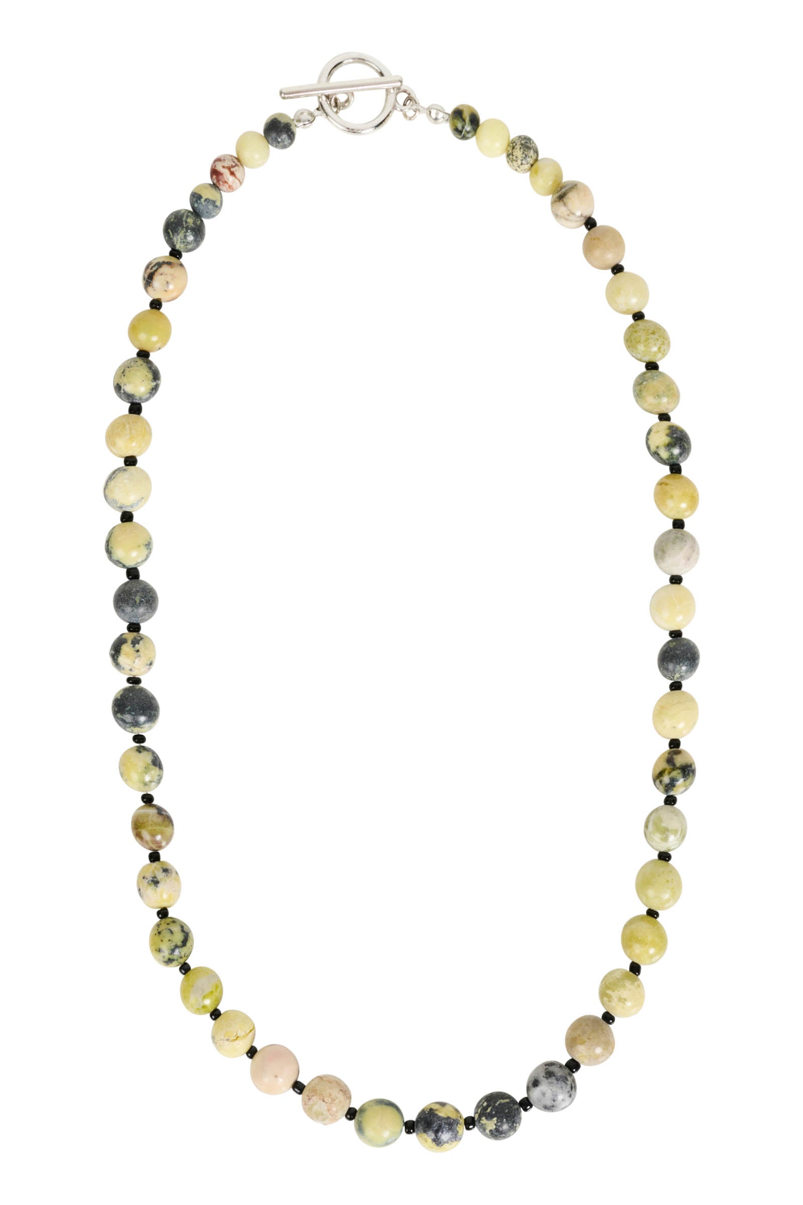 A beaded necklace featuring softly hued natural stones, designed with a bar and hoop closure. A grounding piece to finish off your everyday outfit or layer into more elevated looks.