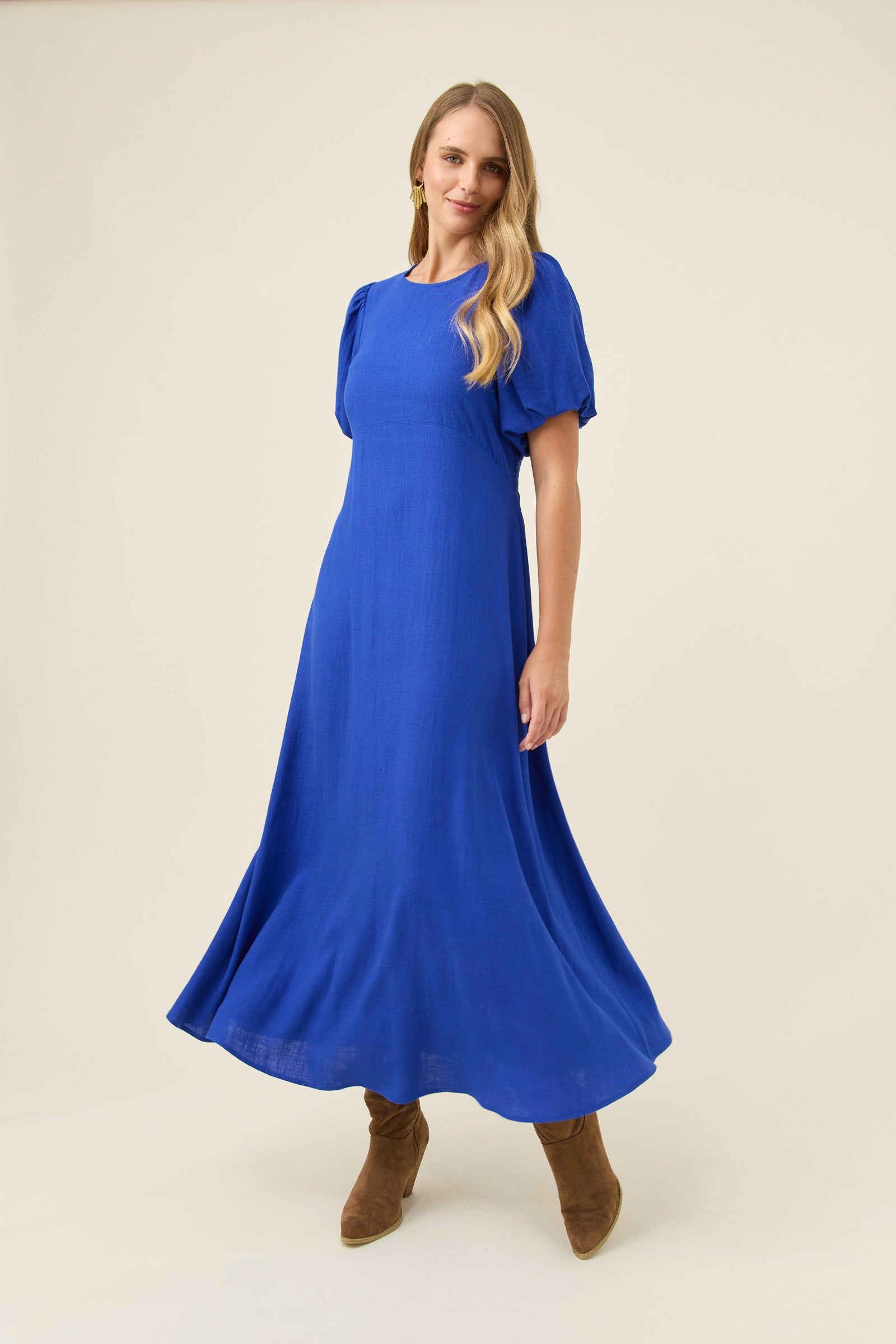 A flowing maxi dress with an empire line shape that feels soft and flattering. The round neckline opens at the back with a keyhole button, while puff sleeves are lined and gently elasticated for comfort. Shirring at the back waist brings ease to the fit, finished with practical side pockets. Pair with a knit cardigan or wear alone for an effortless winter moment.