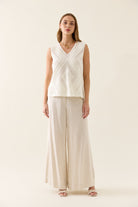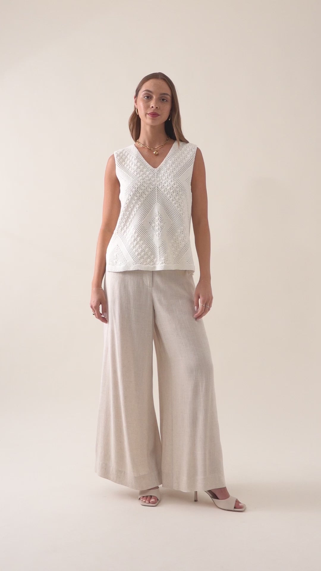 The Sylvie Top is a sleeveless knit with subtle texture and a flattering V-neckline. With a side split hem and diamond pattern finish, it blends structure with softness.