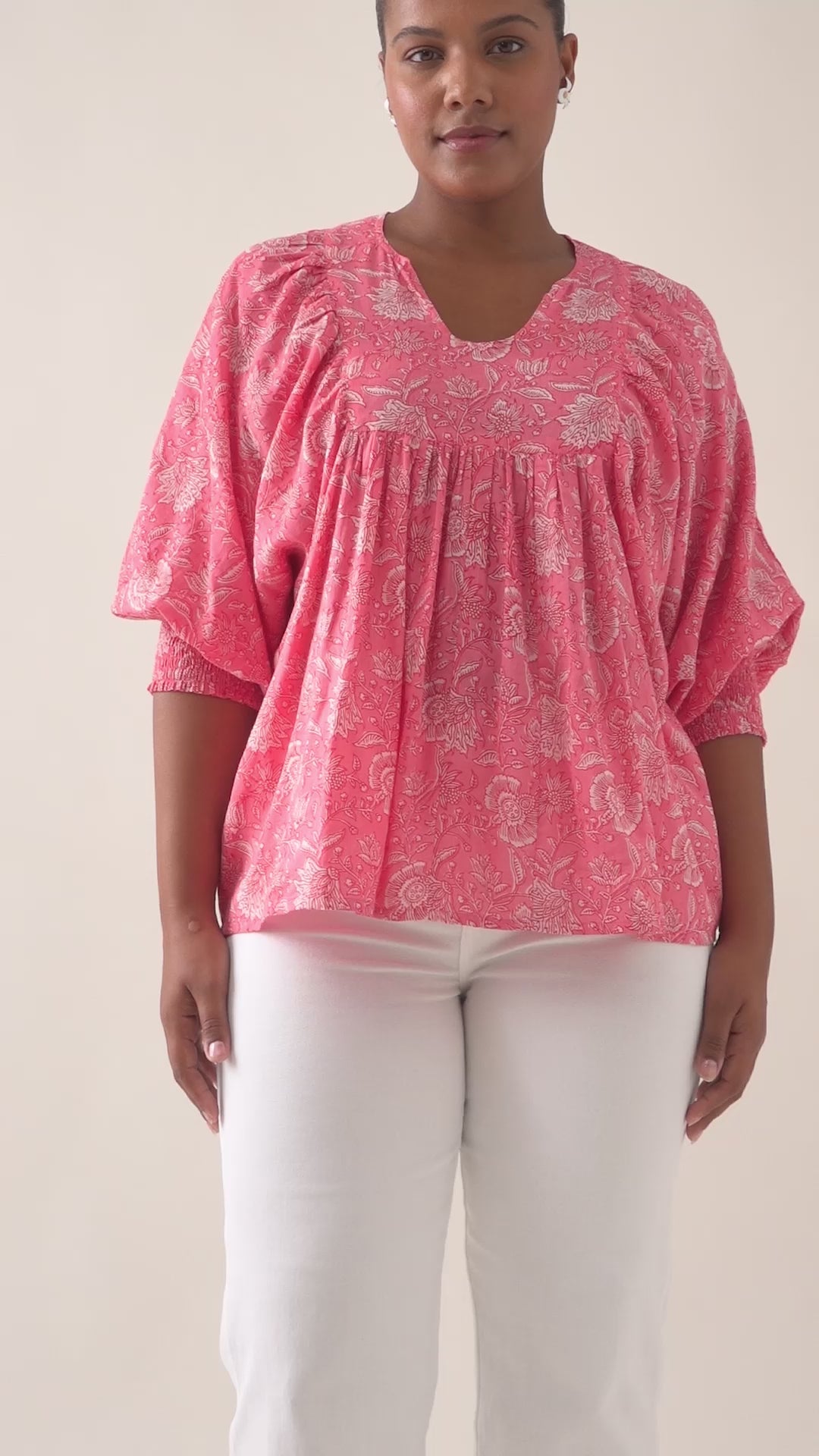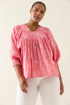 A colourful cotton voile piece with artisanal charm, inspired by floral hand-block. The Wilma Top is hand screen printed and features a soft front yoke, shirred 3/4 sleeves and a relaxed silhouette for everyday ease.