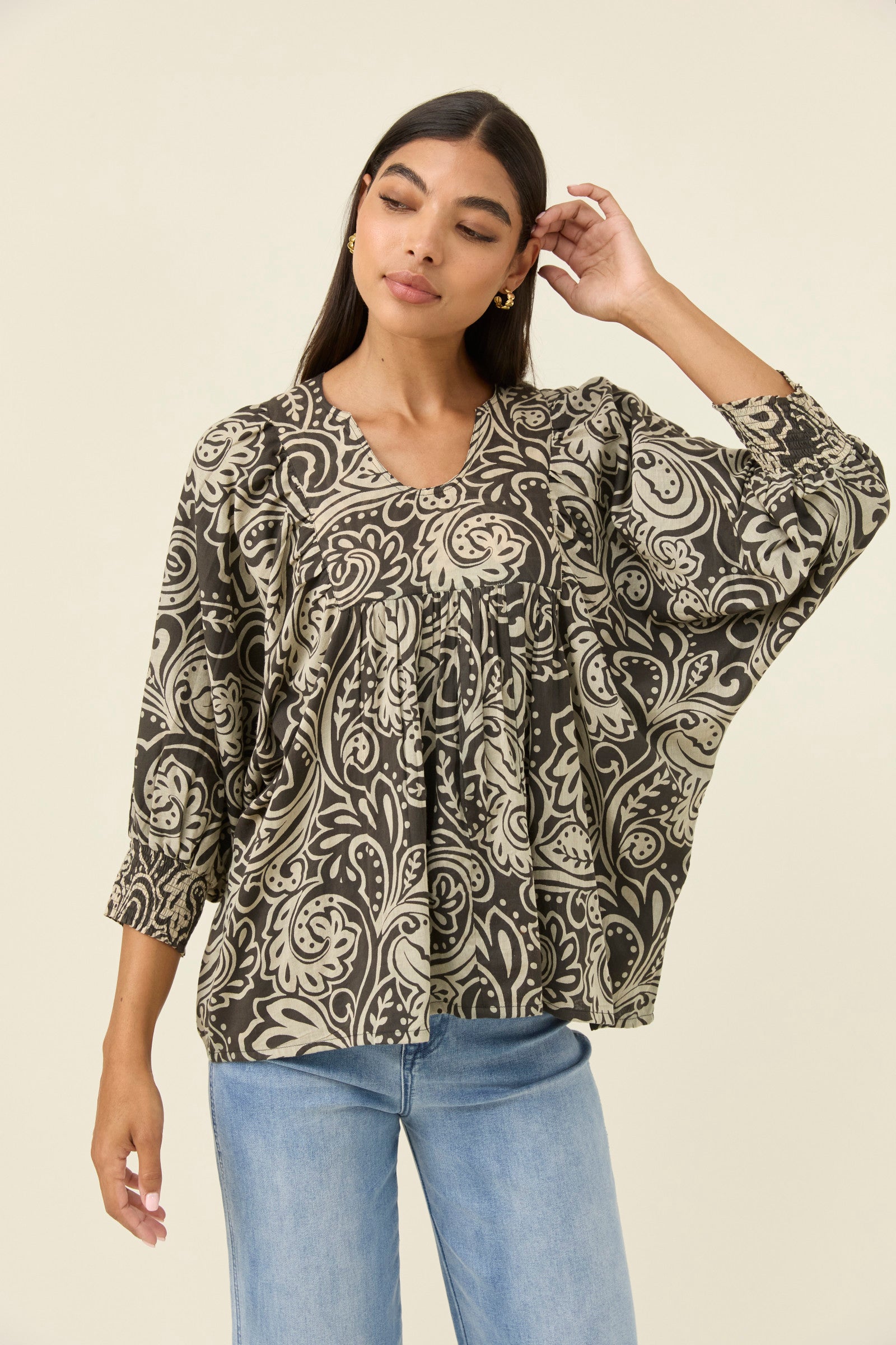 A lightweight cotton voile top with a soft, screen-printed paisley pattern. The front yoke frames the neckline, while the 3/4 sleeves gather into elastic shirred cuffs for gentle volume. Fully lined for comfort, it's an airy, relaxed piece for everyday wear.