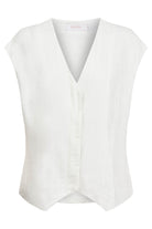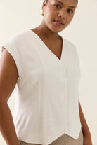 A tailored linen-blend vest designed with subtle panelling for soft shaping through the waist. Fully lined for comfort and structure, with a clean hidden button placket and wide sleeves that provide relaxed coverage.