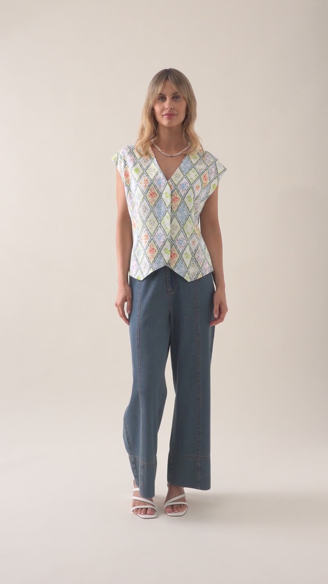 A tailored linen-blend vest designed with subtle panelling for soft shaping through the waist. Fully lined for comfort and structure, with a clean hidden button placket and wide sleeves that provide relaxed coverage.