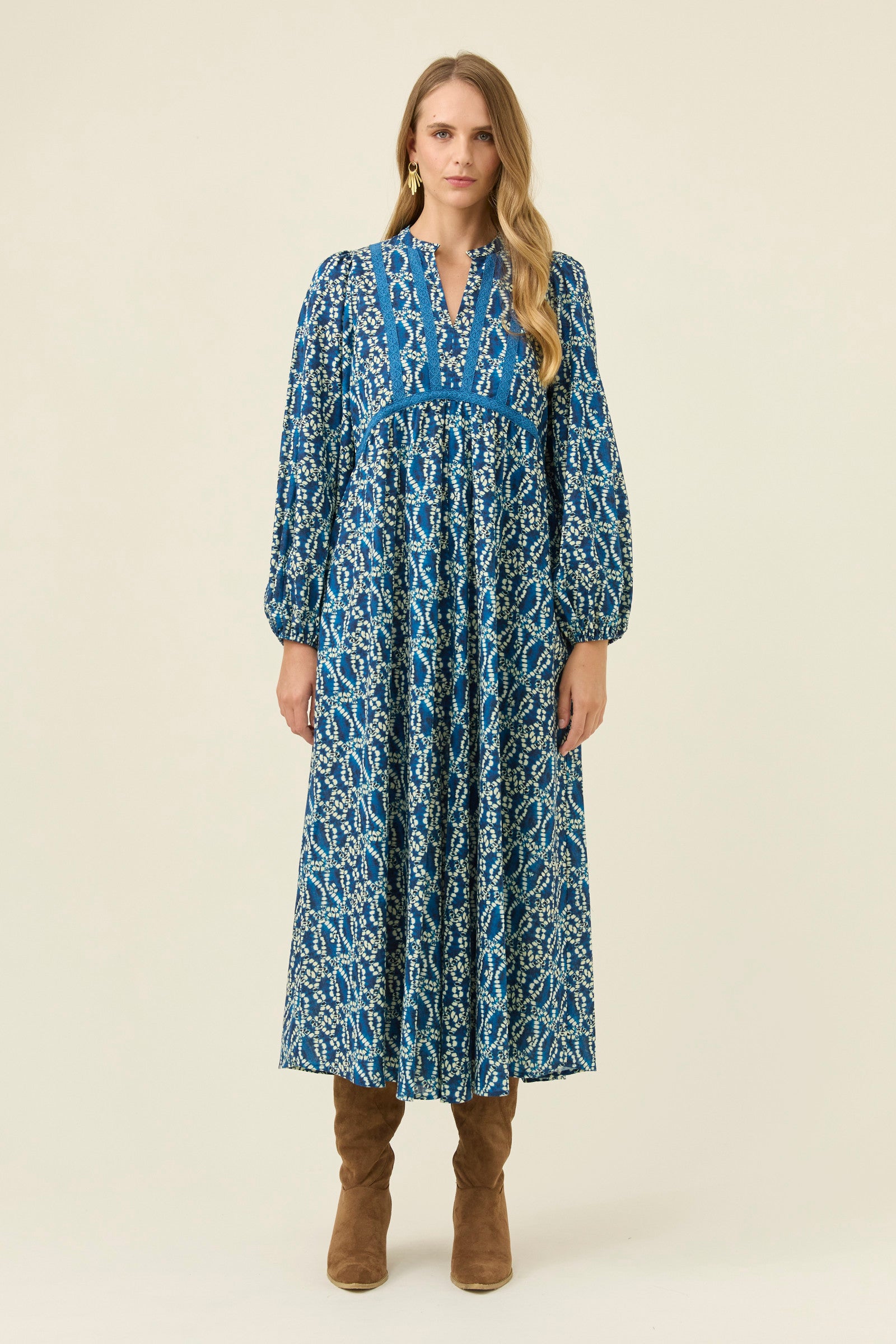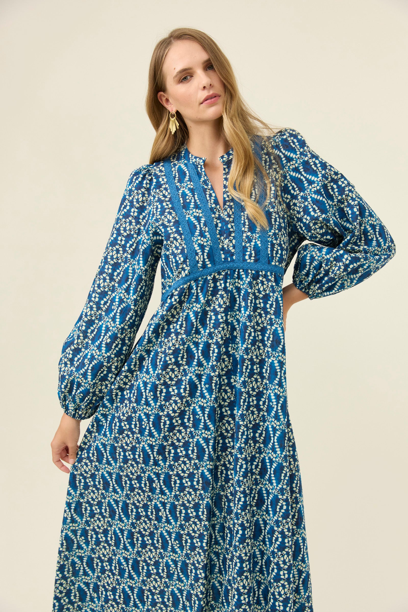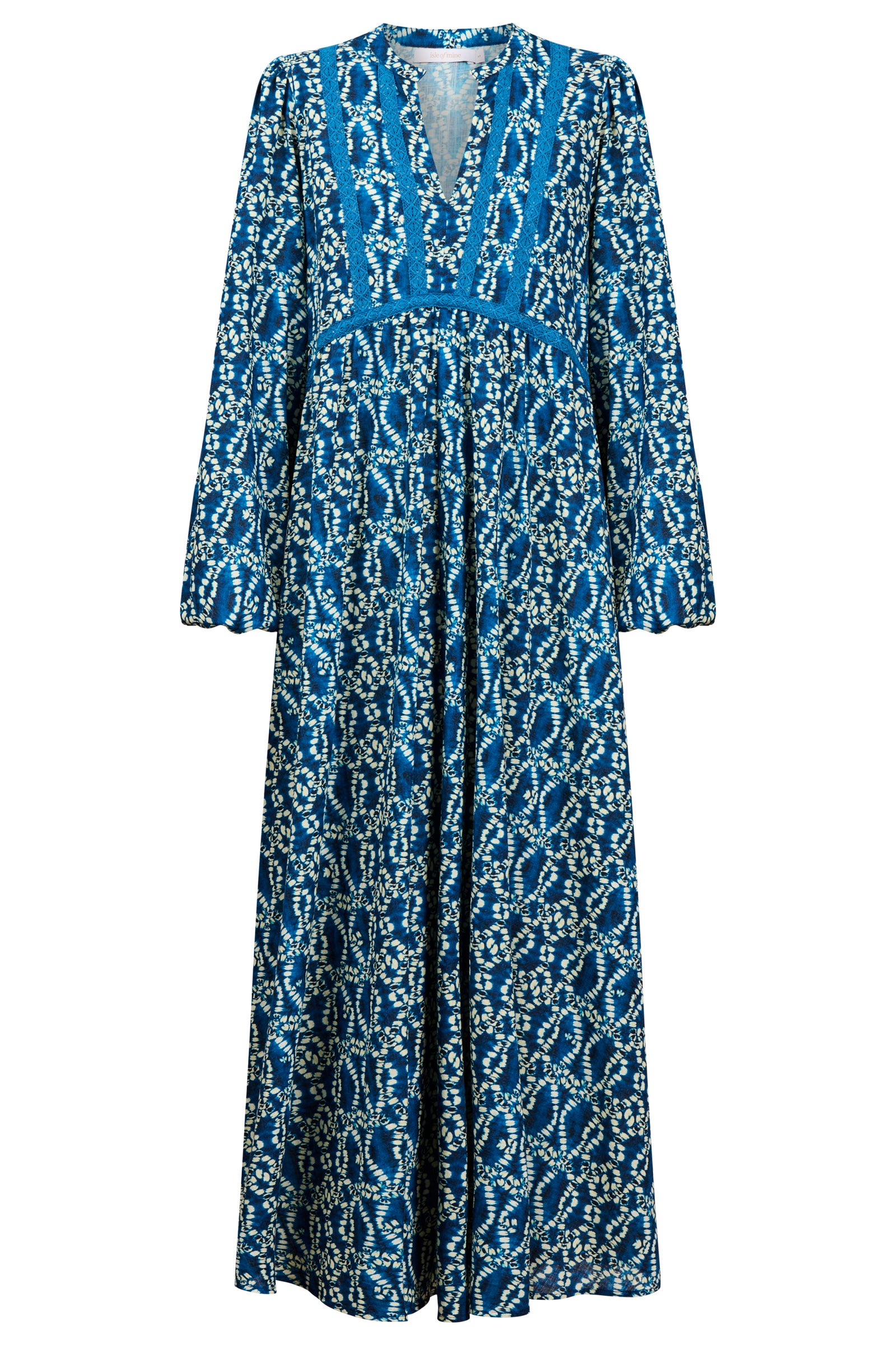 A flowing cotton maxi with soft lace appliqué details that add texture and intricacy. The V-neckline sits gently against the band collar, while the bishop sleeves create a romantic shape. Internal pockets make it a practical choice for dreamy everyday wear.