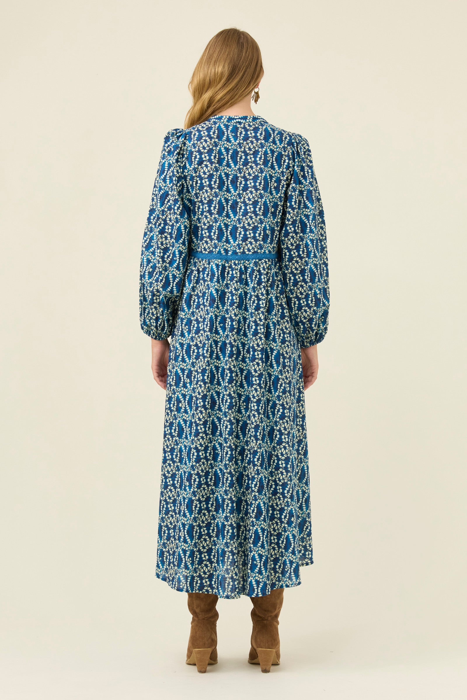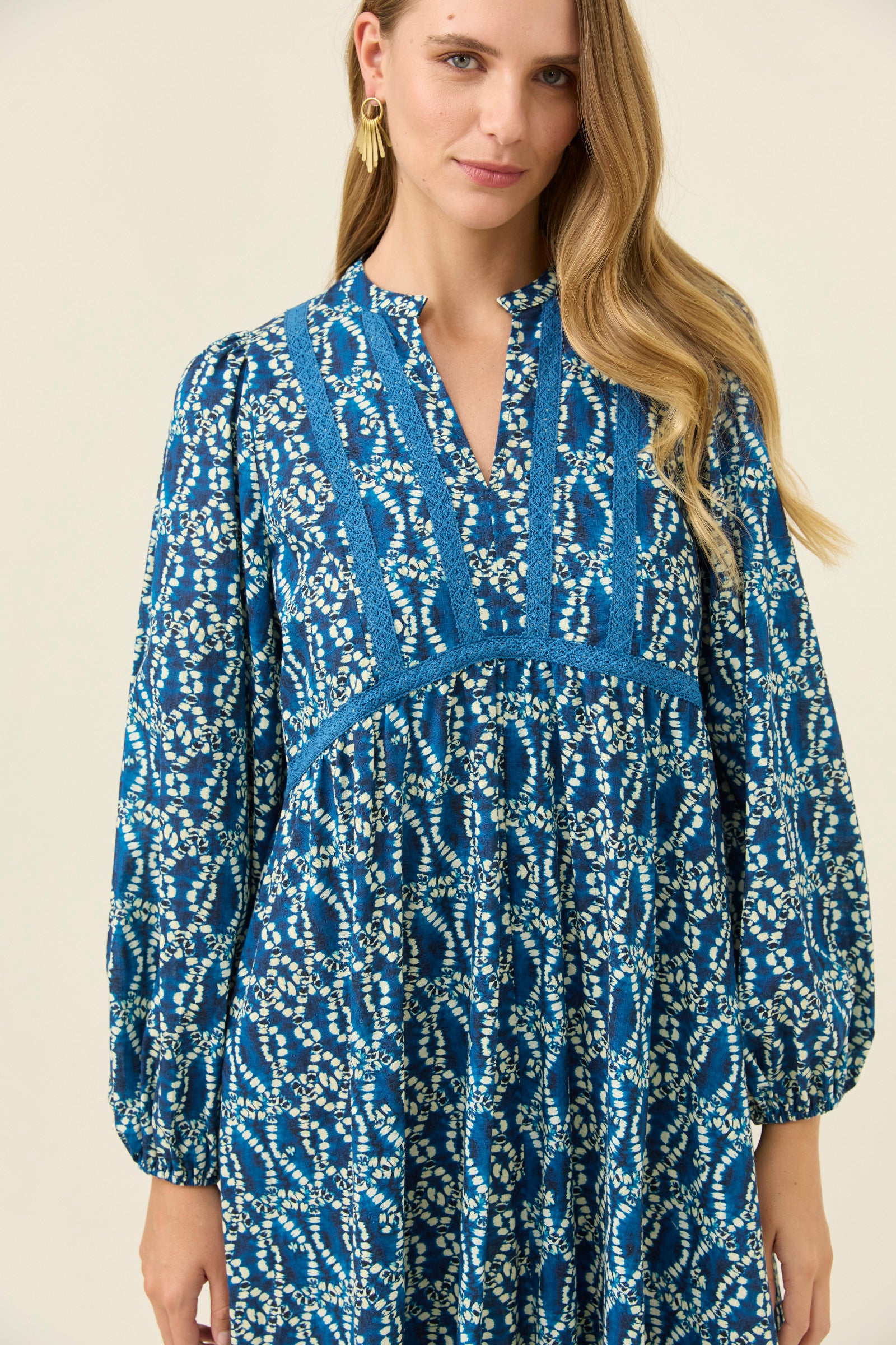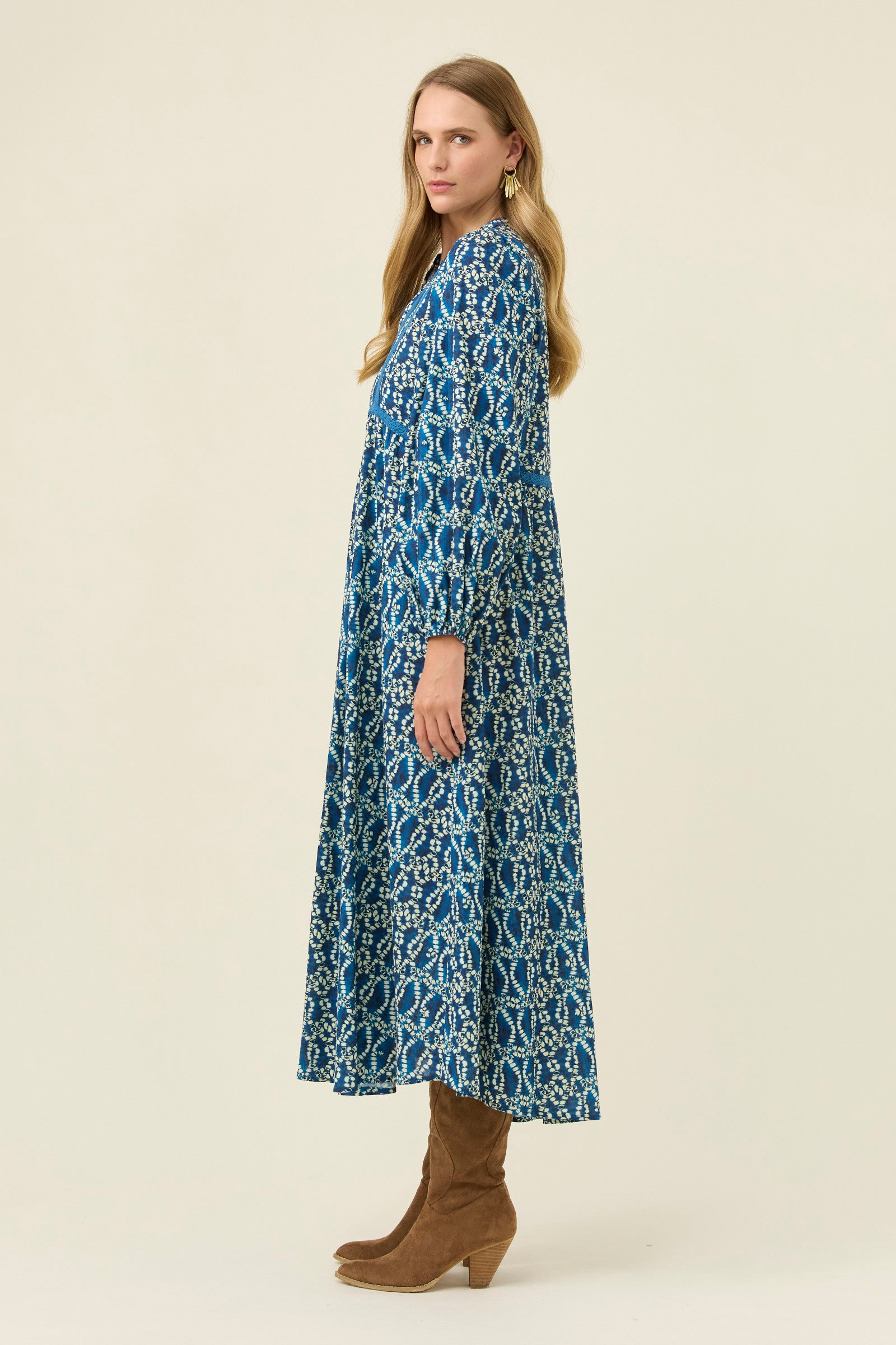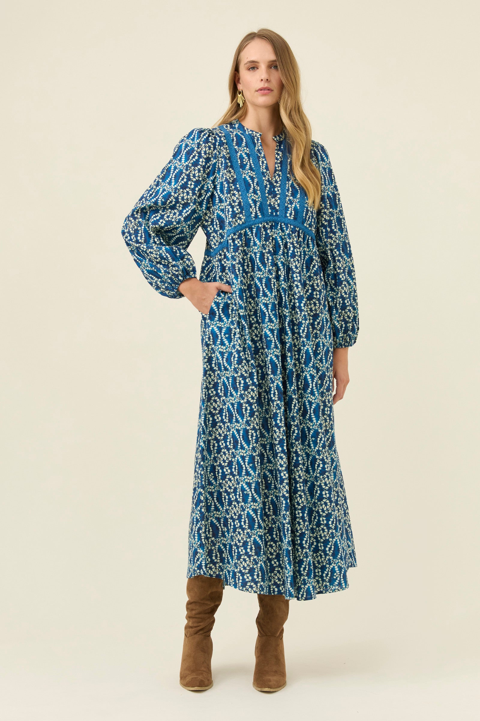 A flowing cotton maxi with soft lace appliqué details that add texture and intricacy. The V-neckline sits gently against the band collar, while the bishop sleeves create a romantic shape. Internal pockets make it a practical choice for dreamy everyday wear.